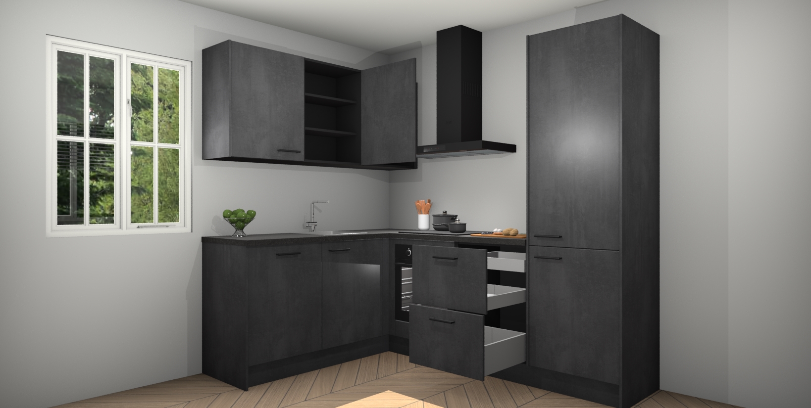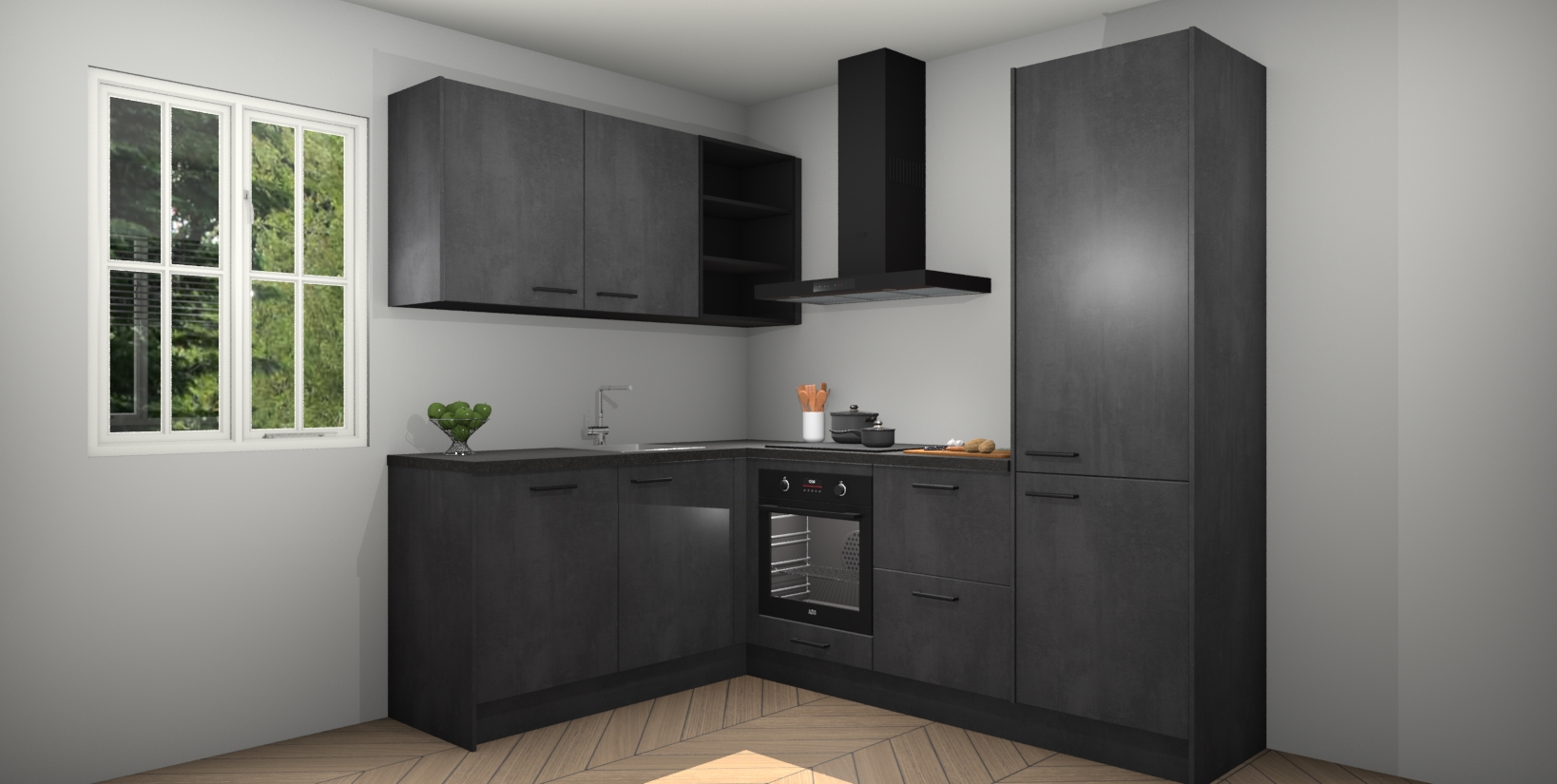 Maak kennis met de Beton Zwarte keuken Boekarest, een moderne hoekkeuken waar al uw vrienden en familie jaloers op zullen zijn! Het verbluffende mooie ontwerp past in elk interieur en is een ideale keuze voor wie op zoek is naar een klassieke, maar verfijnde look.