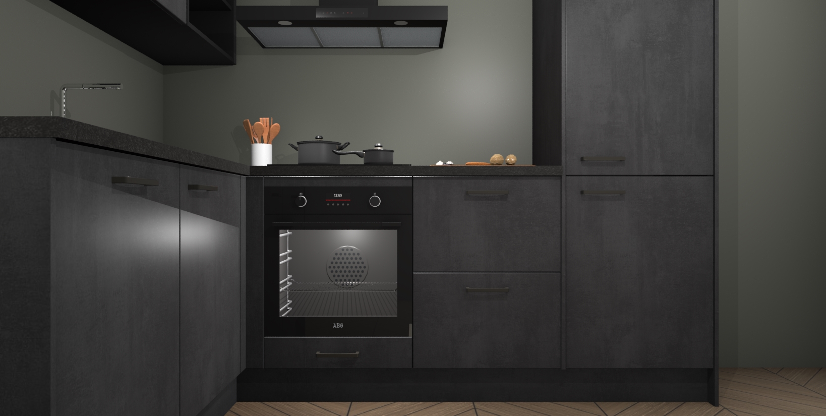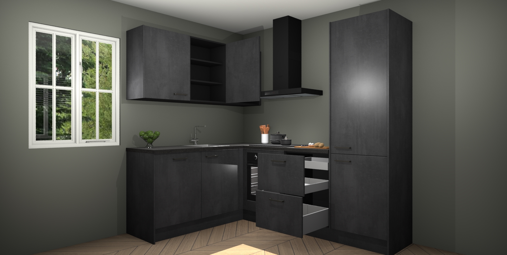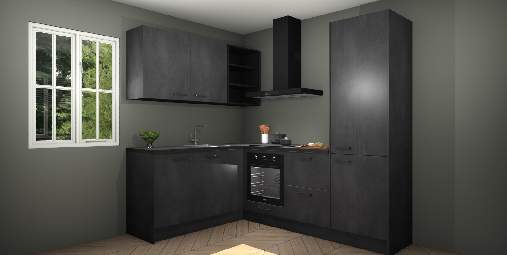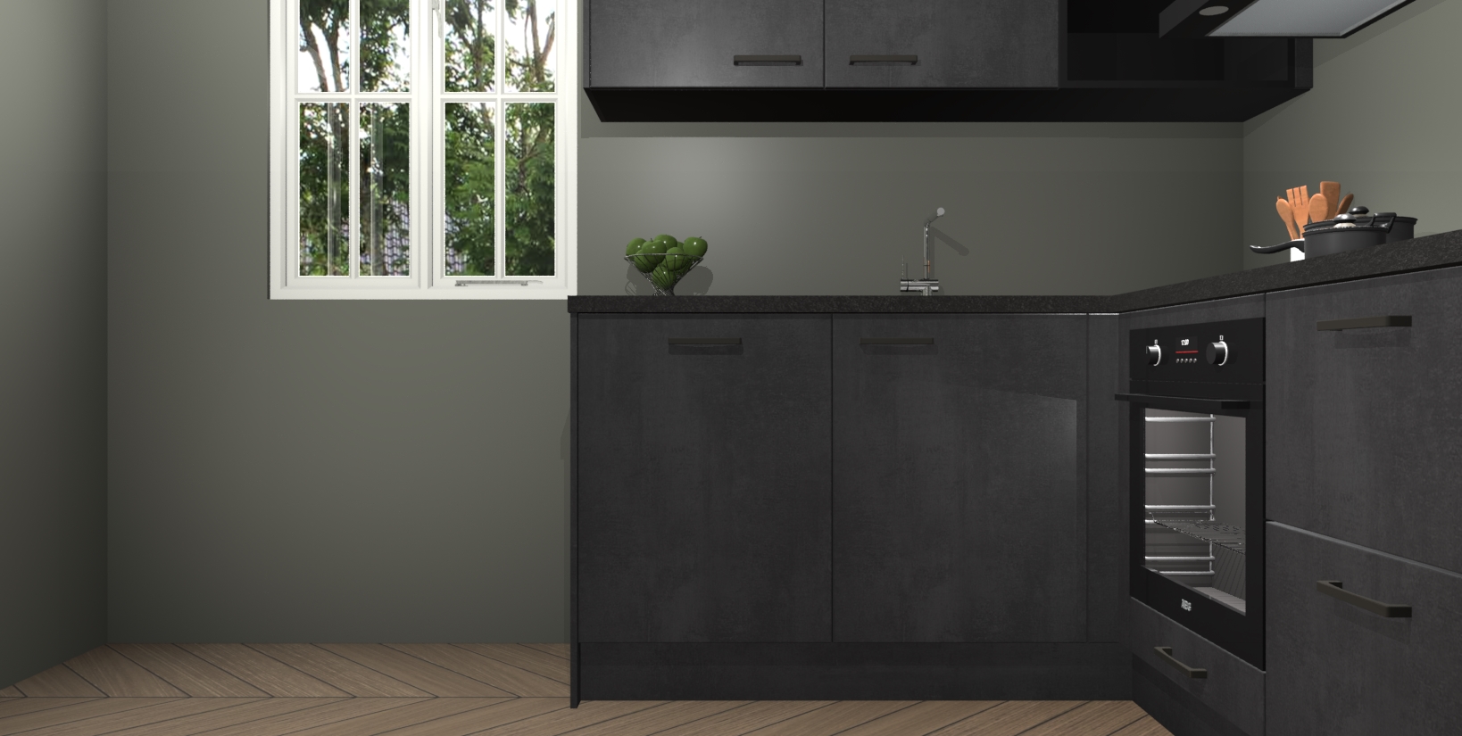 Maak kennis met de Beton Zwarte keuken Boekarest, een moderne hoekkeuken waar al uw vrienden en familie jaloers op zullen zijn! Het verbluffende mooie ontwerp past in elk interieur en is een ideale keuze voor wie op zoek is naar een klassieke, maar verfijnde look.