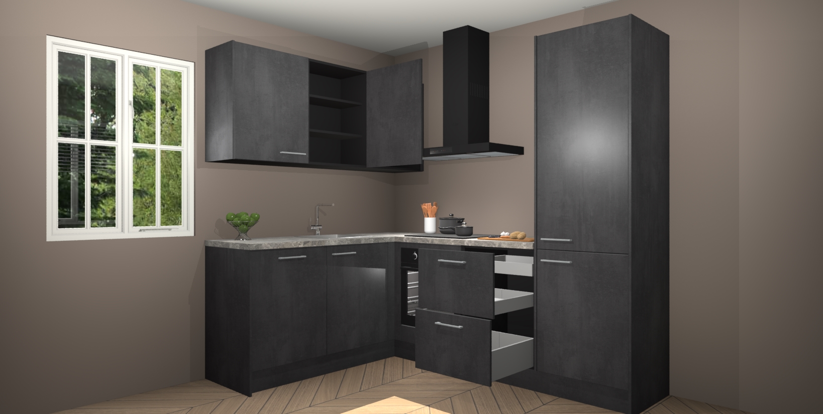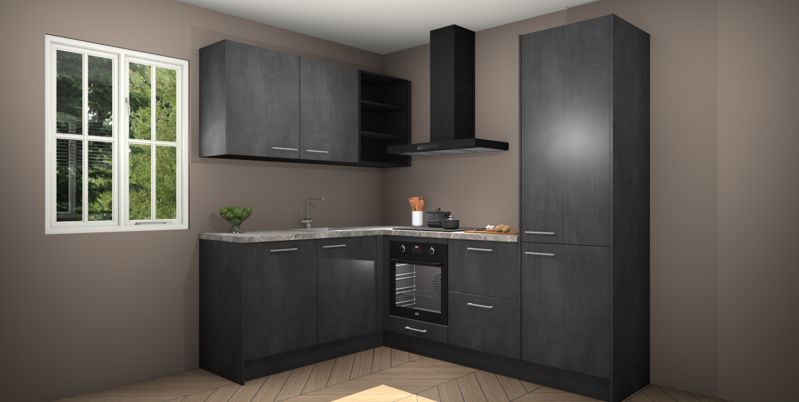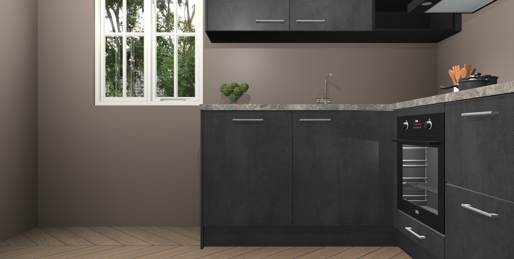 Maak kennis met de Beton Zwarte keuken Boekarest, een moderne hoekkeuken waar al uw vrienden en familie jaloers op zullen zijn! Het verbluffende mooie ontwerp past in elk interieur en is een ideale keuze voor wie op zoek is naar een klassieke, maar verfijnde look.