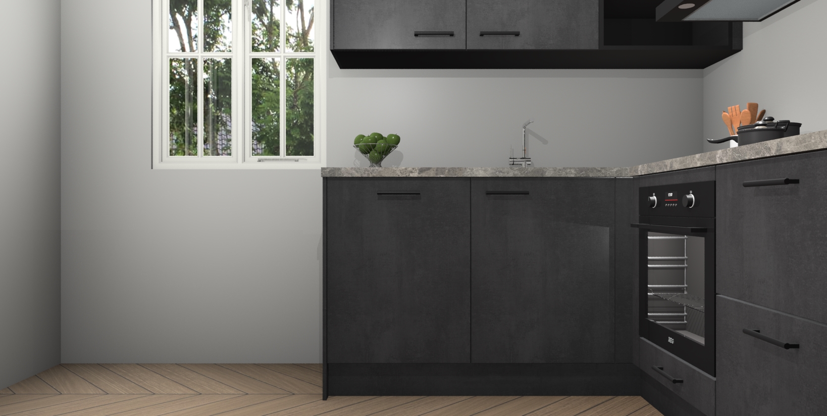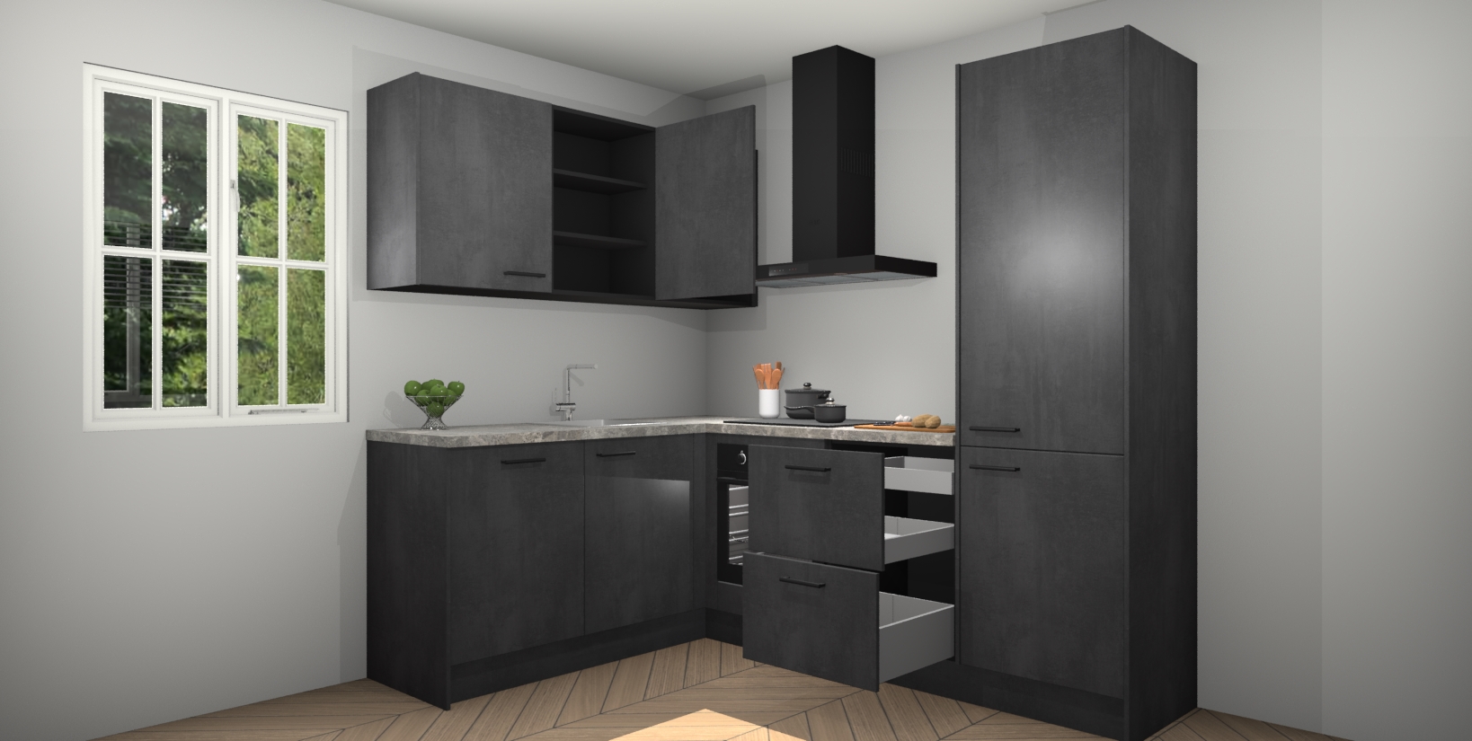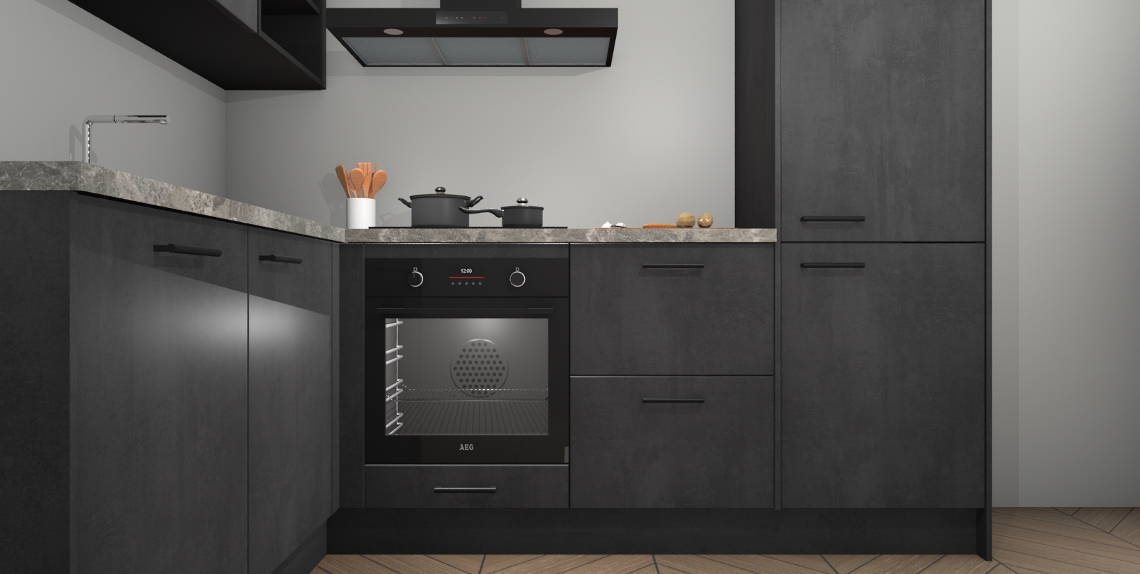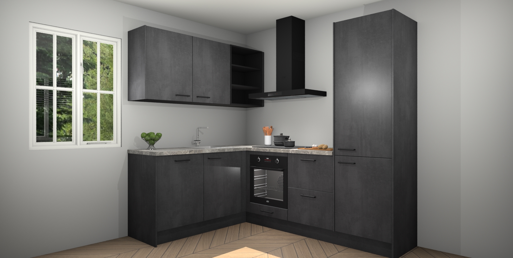 Maak kennis met de Beton Zwarte keuken Boekarest, een moderne hoekkeuken waar al uw vrienden en familie jaloers op zullen zijn! Het verbluffende mooie ontwerp past in elk interieur en is een ideale keuze voor wie op zoek is naar een klassieke, maar verfijnde look.