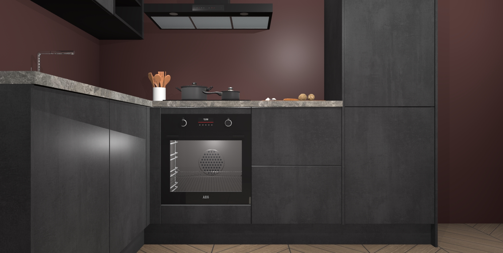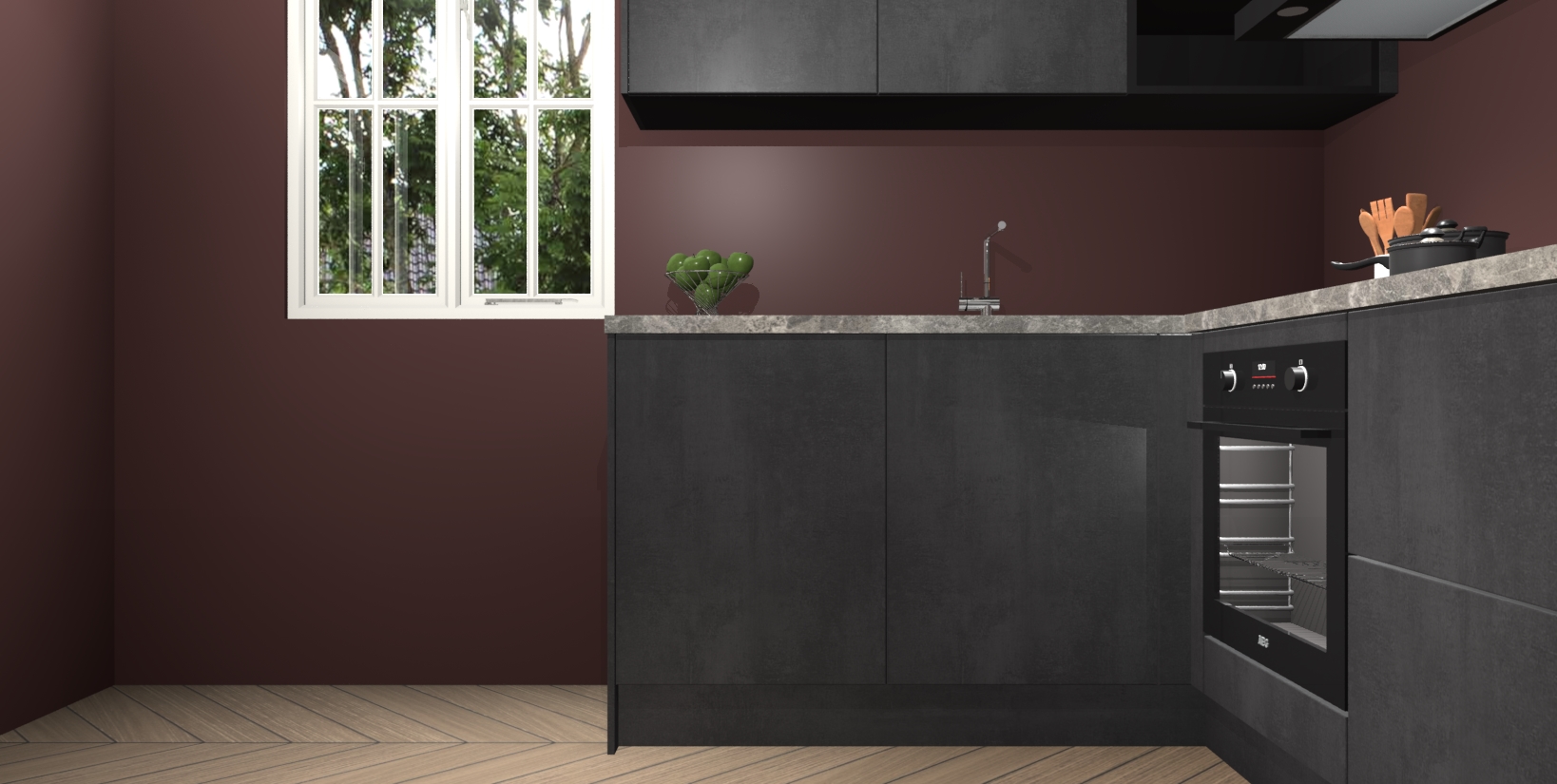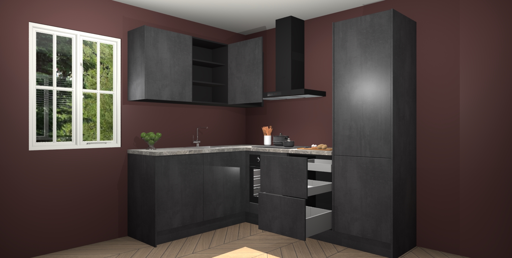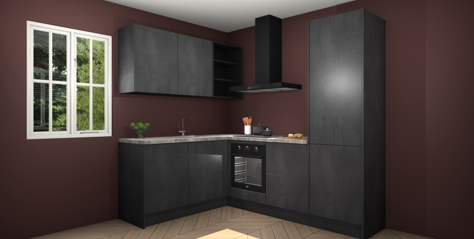 Maak kennis met de Beton Zwarte keuken Boekarest, een moderne hoekkeuken waar al uw vrienden en familie jaloers op zullen zijn! Het verbluffende mooie ontwerp past in elk interieur en is een ideale keuze voor wie op zoek is naar een klassieke, maar verfijnde look.