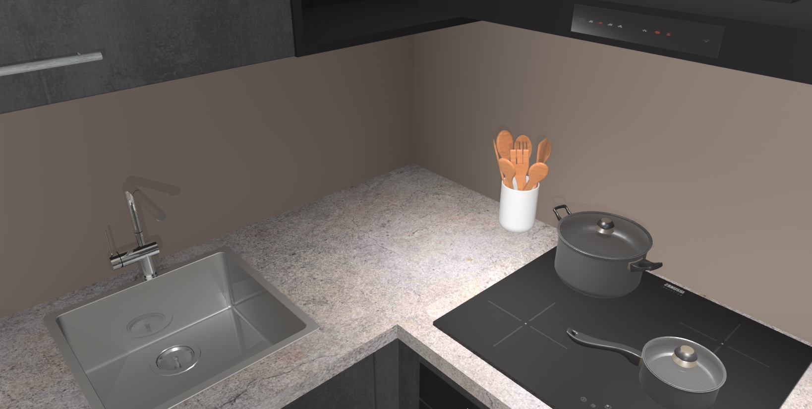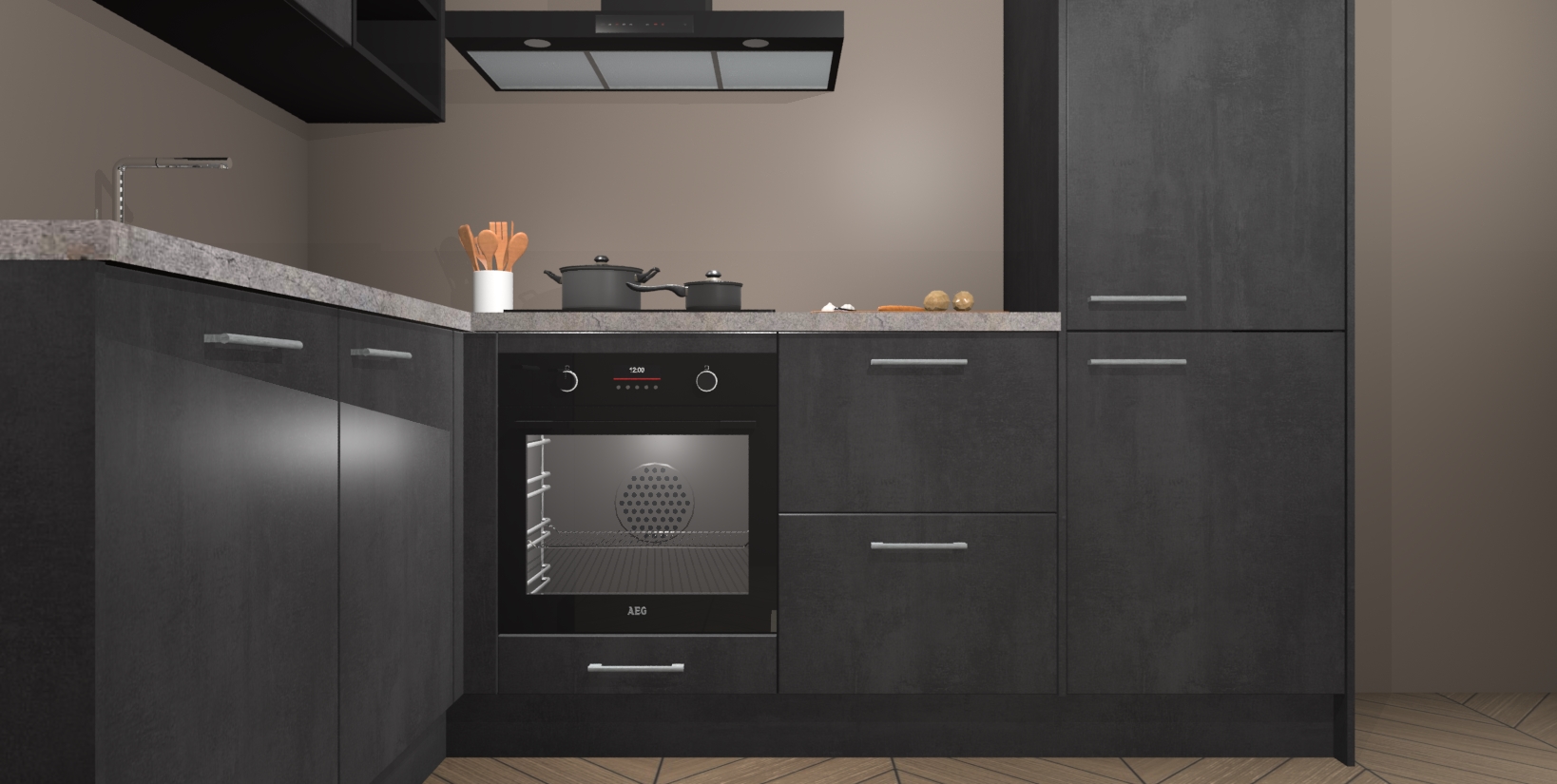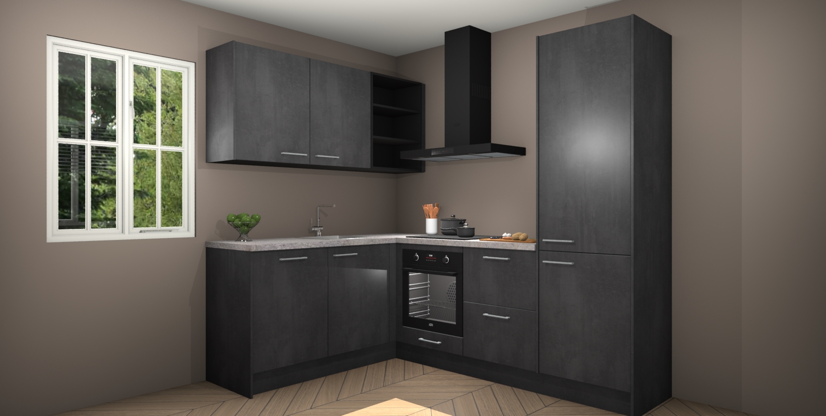 Maak kennis met de Beton Zwarte keuken Boekarest, een moderne hoekkeuken waar al uw vrienden en familie jaloers op zullen zijn! Het verbluffende mooie ontwerp past in elk interieur en is een ideale keuze voor wie op zoek is naar een klassieke, maar verfijnde look.