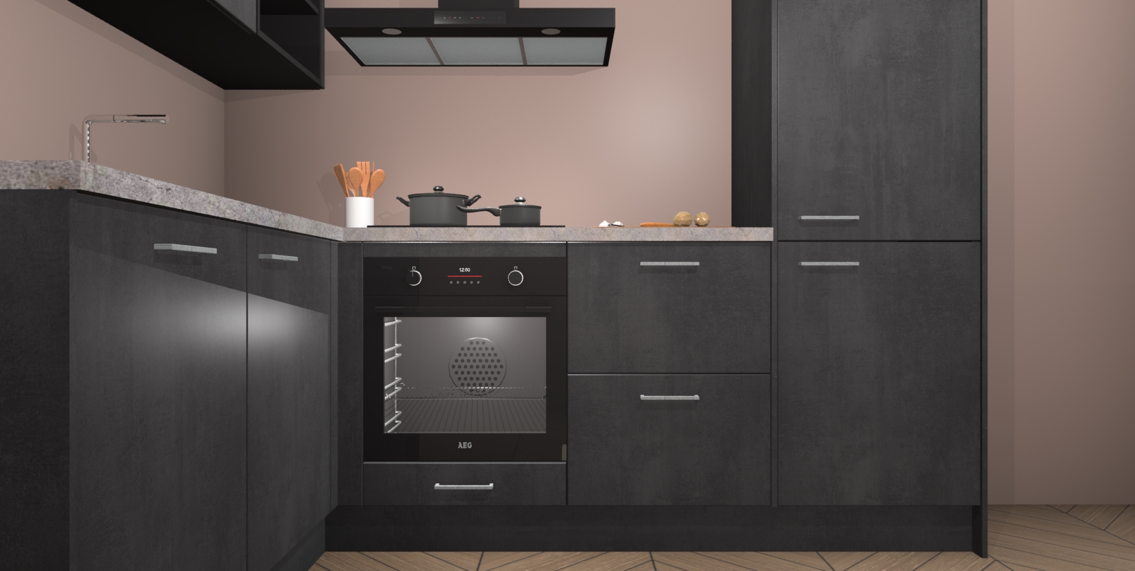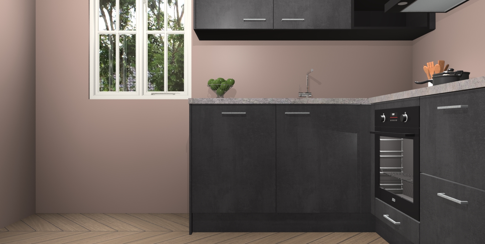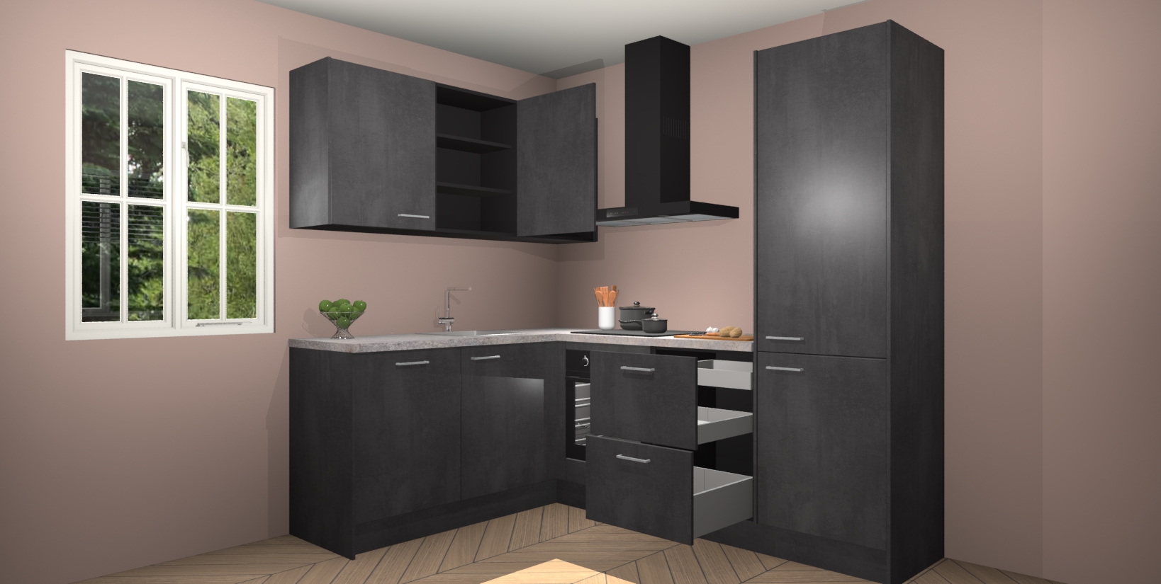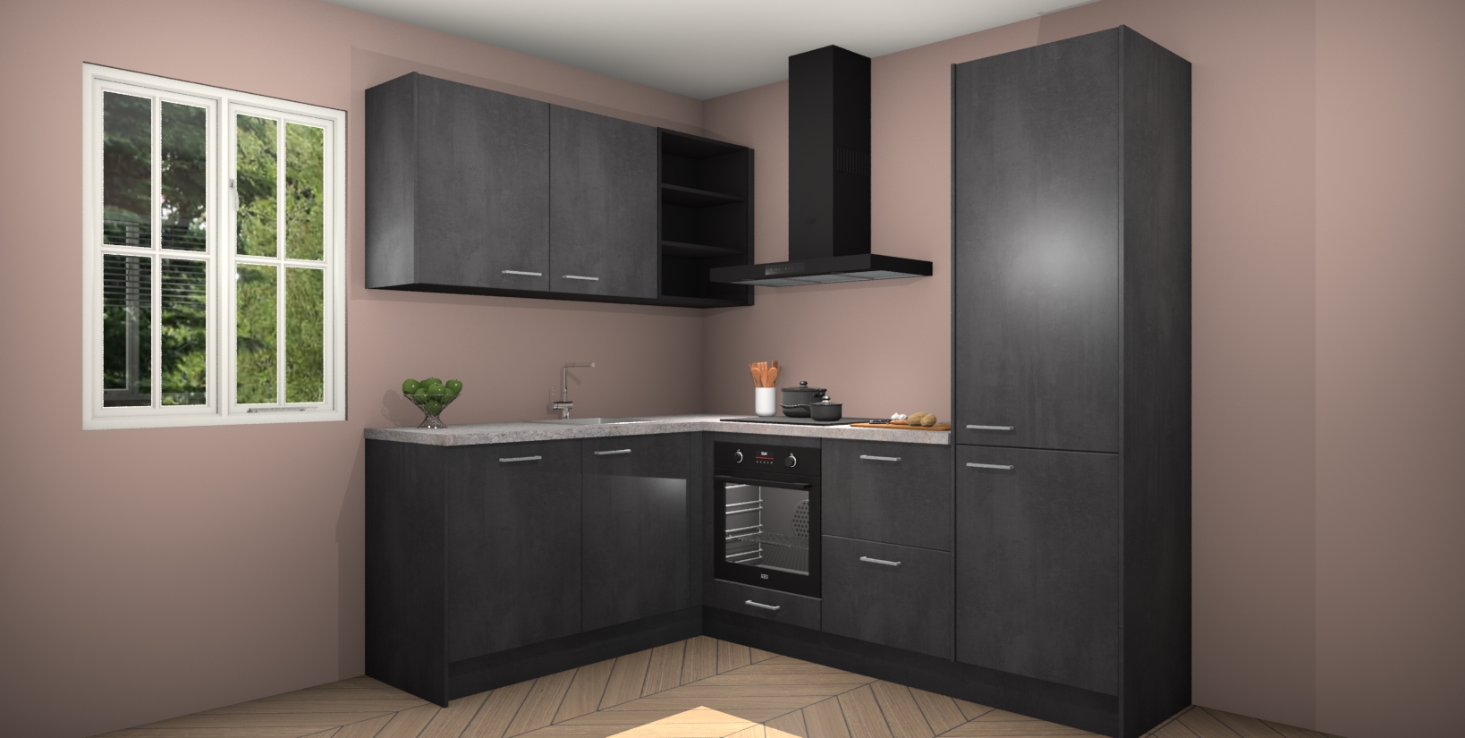 Maak kennis met de Beton Zwarte keuken Boekarest, een moderne hoekkeuken waar al uw vrienden en familie jaloers op zullen zijn! Het verbluffende mooie ontwerp past in elk interieur en is een ideale keuze voor wie op zoek is naar een klassieke, maar verfijnde look.