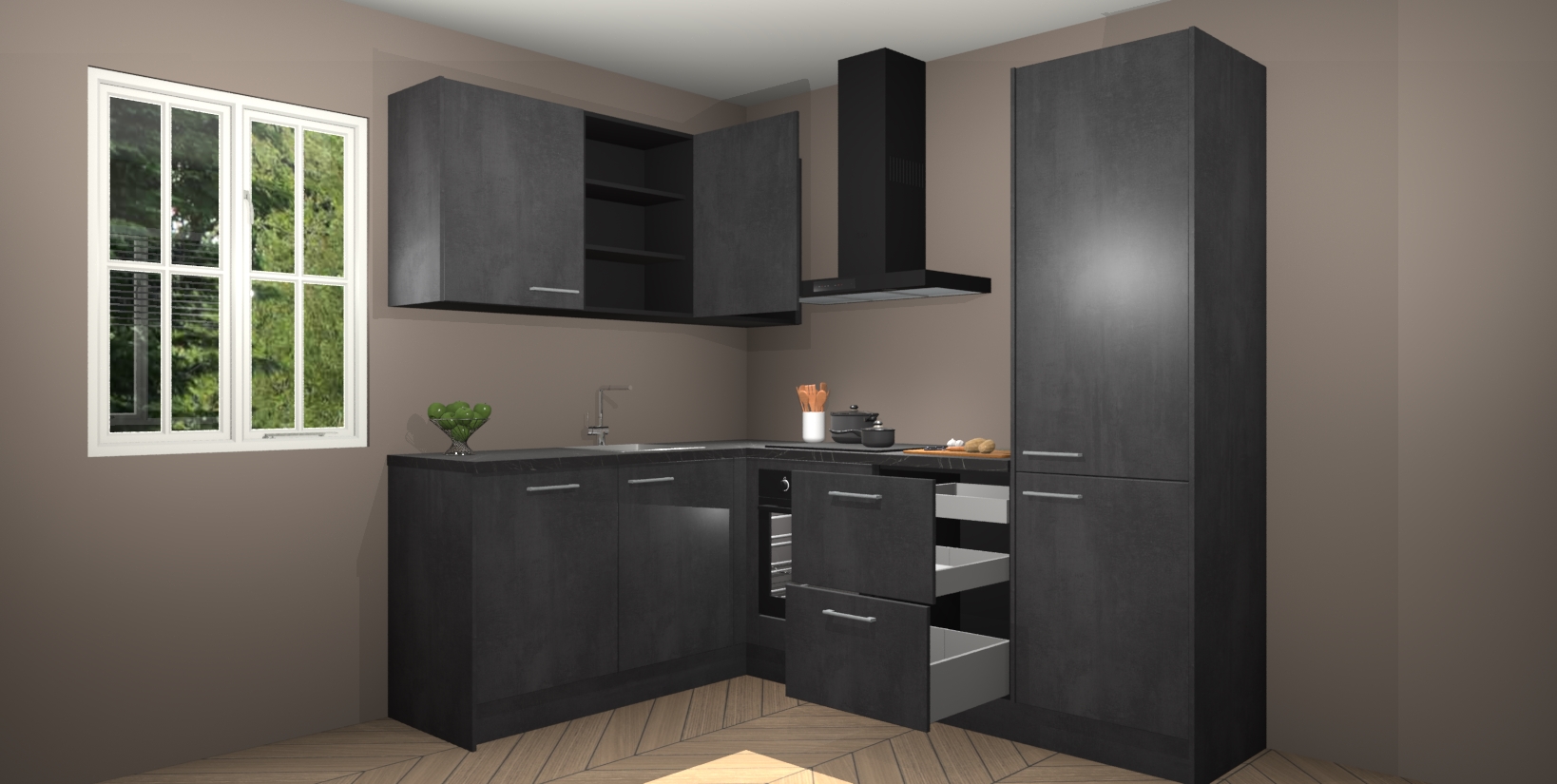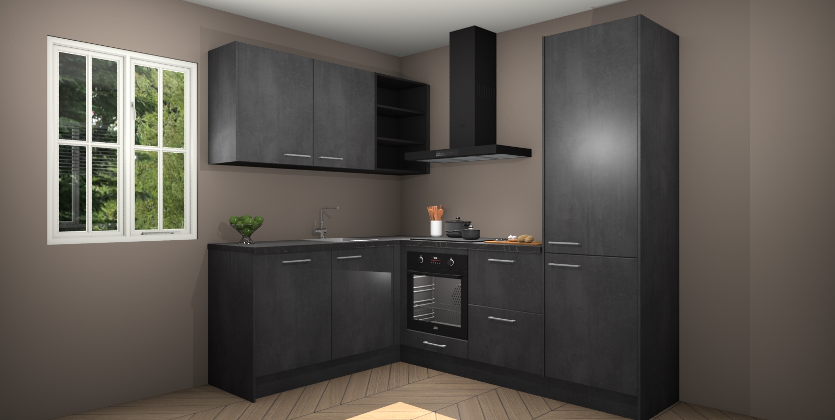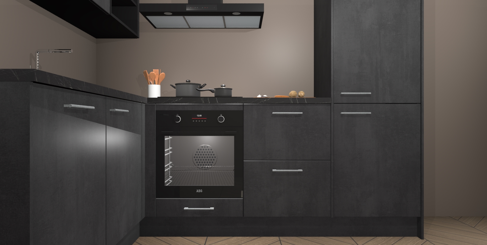 Maak kennis met de Beton Zwarte keuken Boekarest, een moderne hoekkeuken waar al uw vrienden en familie jaloers op zullen zijn! Het verbluffende mooie ontwerp past in elk interieur en is een ideale keuze voor wie op zoek is naar een klassieke, maar verfijnde look.