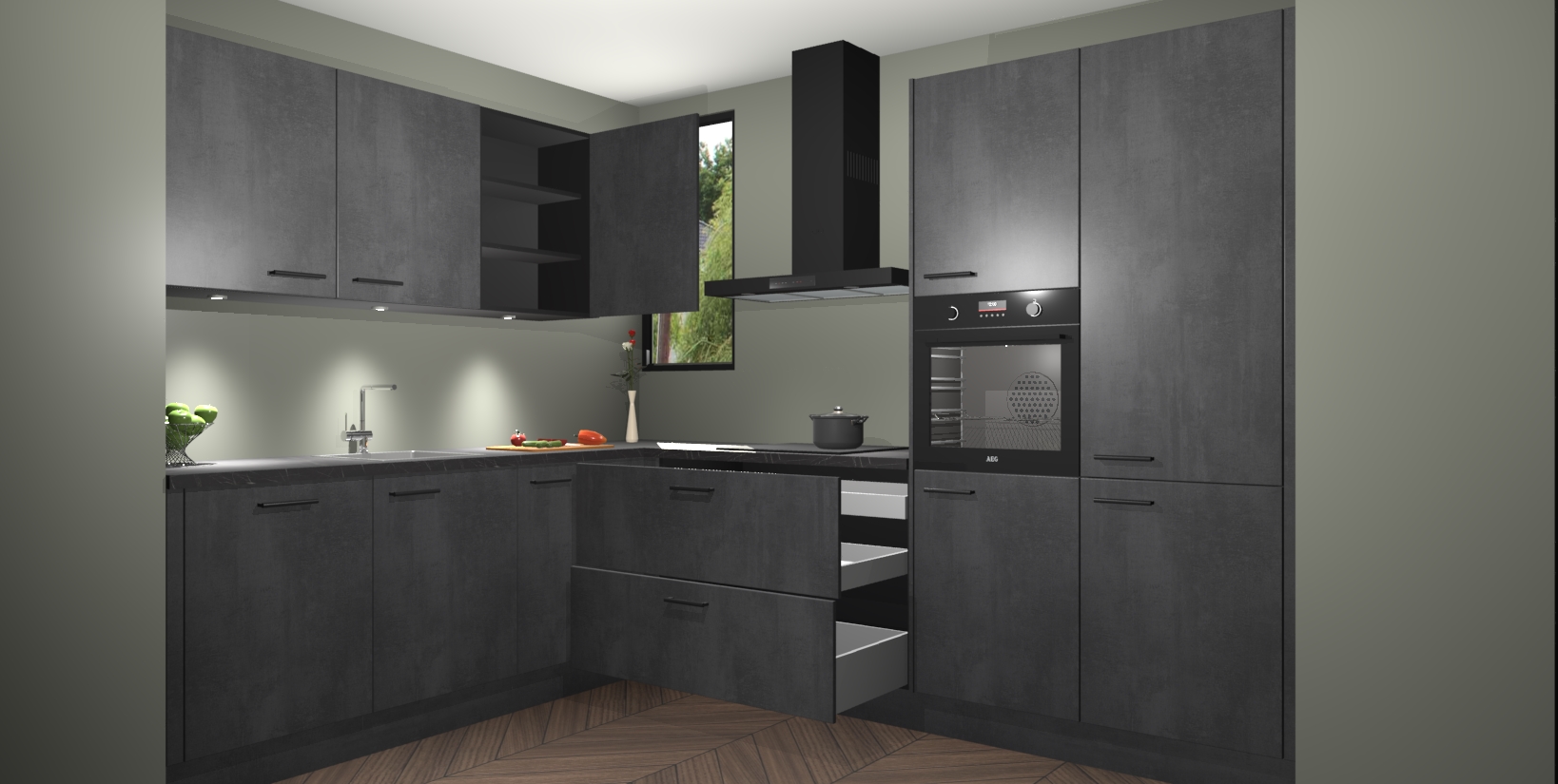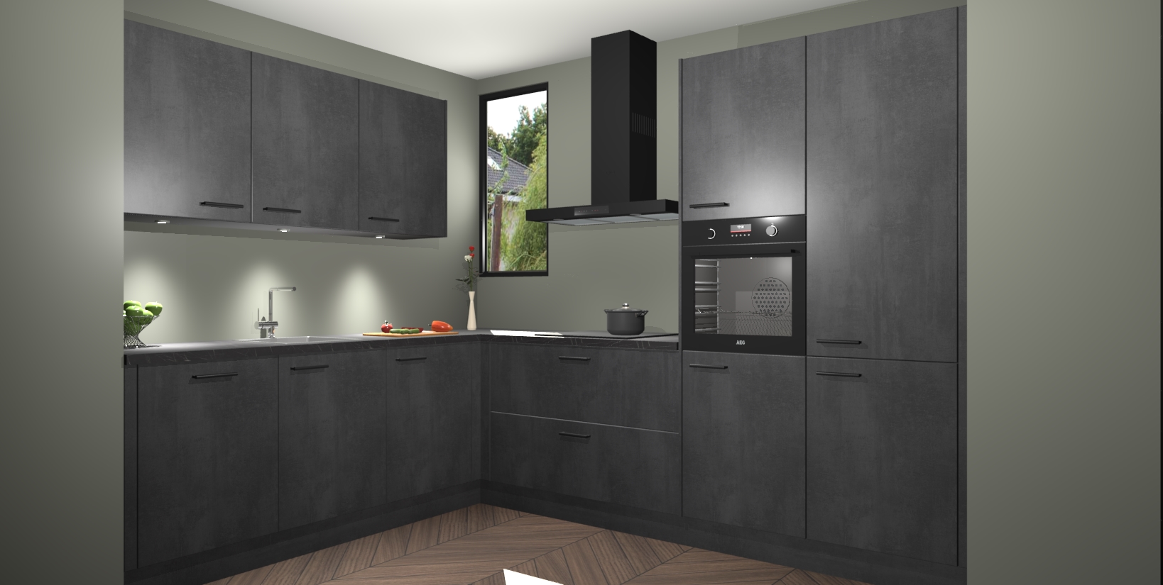 Maak u keuken elegant en verfijnd met de beton zwarte keuken Buenos Aires! Dit prachtige stuk heeft warme kleuren voor een strak, modern gevoel dat u de adem zal benemen. De handgrepen heeft net als de binnenkant van de kasten dezelfde beton zwarte afwerking, waardoor alles er nog beter uitziet.