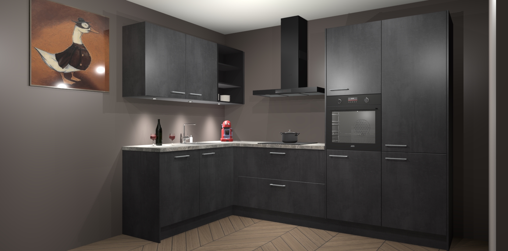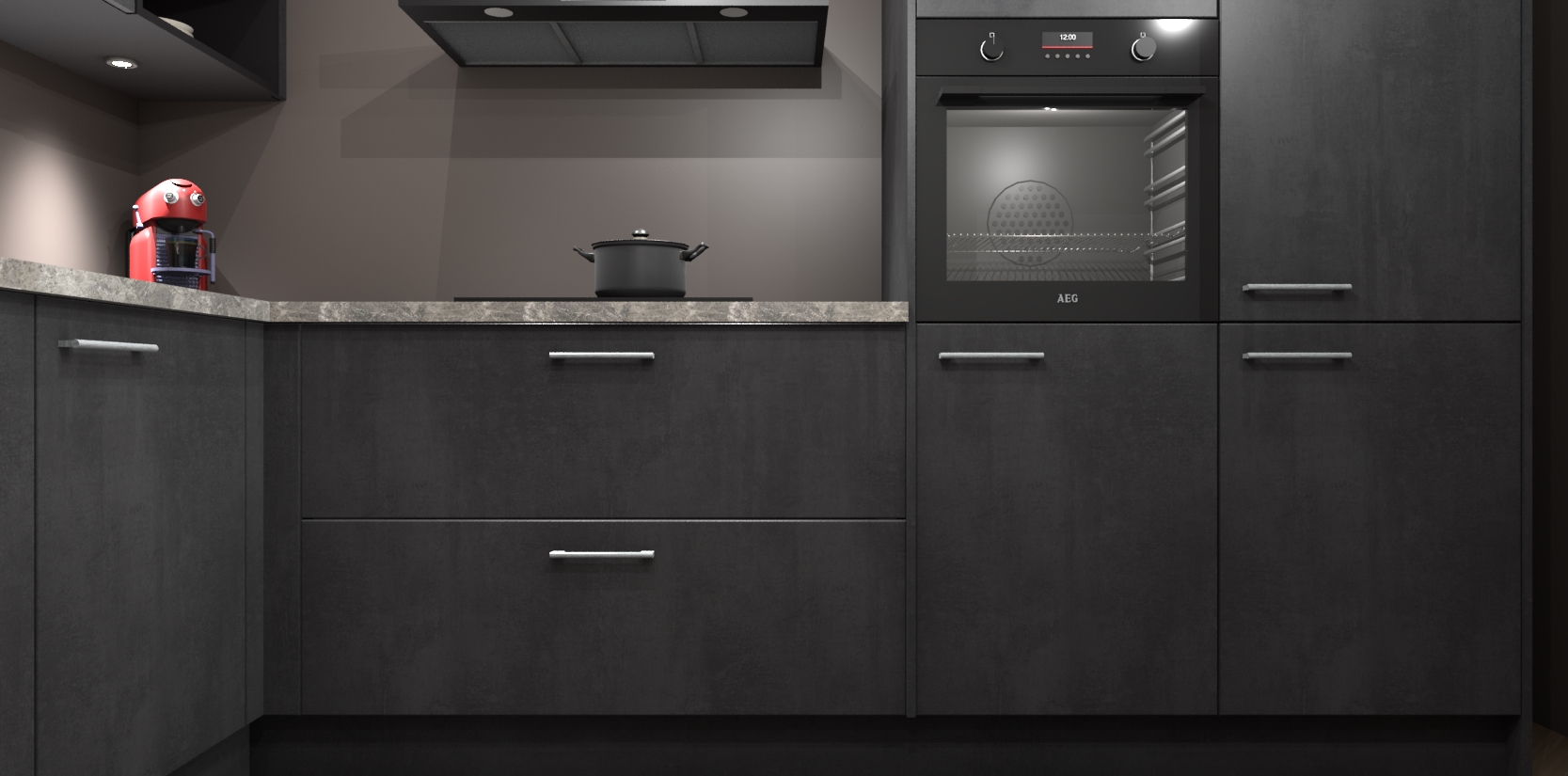 De Beton Zwarte keuken Cognac is een adembenemend ontwerp met een modern en tijdloos uiterlijk. Deze luxe keuken straalt echt aristocratisch uit, waardoor uw koken plezieriger zal worden! Het prachtige design begint bij de hoekkeuken, wat perfect past bij elk type interieur. Bovendien bevat deze hoogwaardige set vijf inbouwapparaten - van oven tot koelkast - die via bestelling naar AEG geüpgraded kunnen worden!