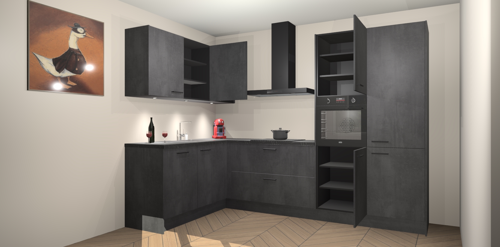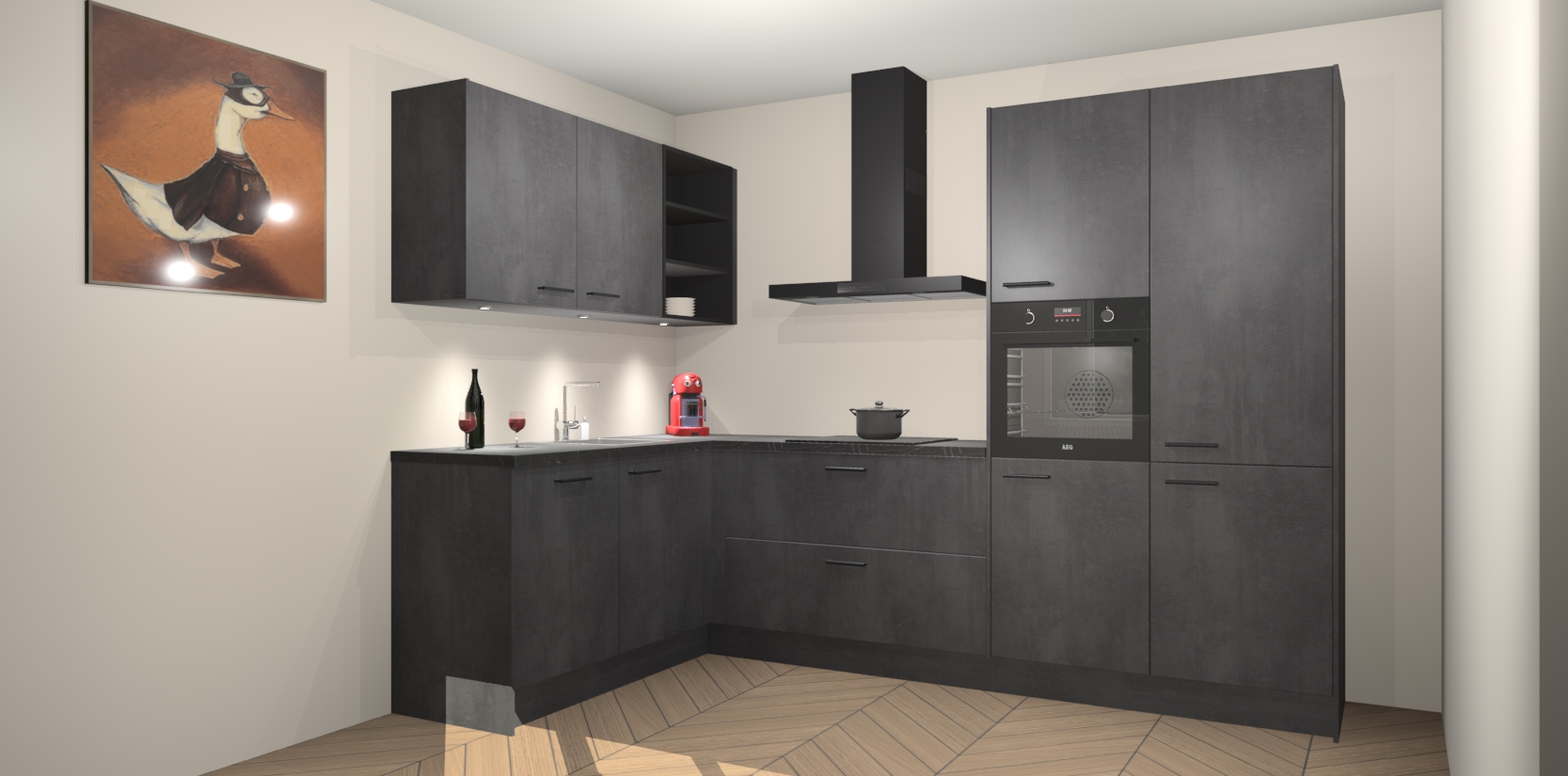 De Beton Zwarte keuken Cognac is een adembenemend ontwerp met een modern en tijdloos uiterlijk. Deze luxe keuken straalt echt aristocratisch uit, waardoor uw koken plezieriger zal worden! Het prachtige design begint bij de hoekkeuken, wat perfect past bij elk type interieur. Bovendien bevat deze hoogwaardige set vijf inbouwapparaten - van oven tot koelkast - die via bestelling naar AEG geüpgraded kunnen worden!