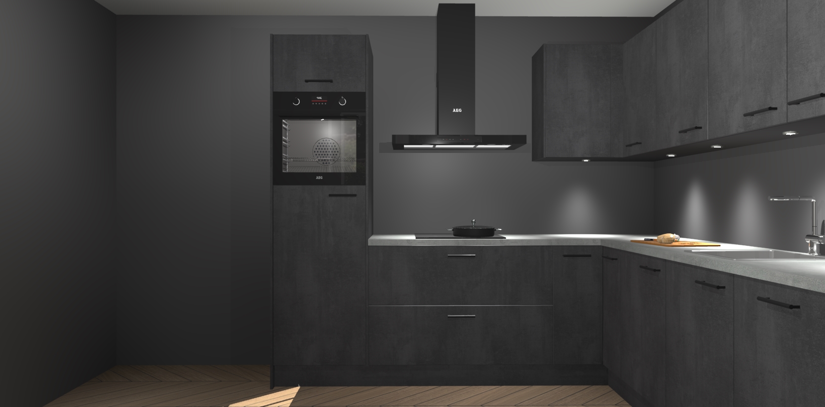 De Beton Zwarte keuken Debar is uitgerust met vijf inbouwapparaten die elke kooktaak handig en efficiënt maken. Een oven, inductiekookplaat, afzuigkap, vaatwasser en koelkast zijn standaard, maar kunnen na bestelling eenvoudig worden geupgrade naar AEG. Profiteer vervolgens van de softclose deuren voor snelle toegang en geruisloze toegang.