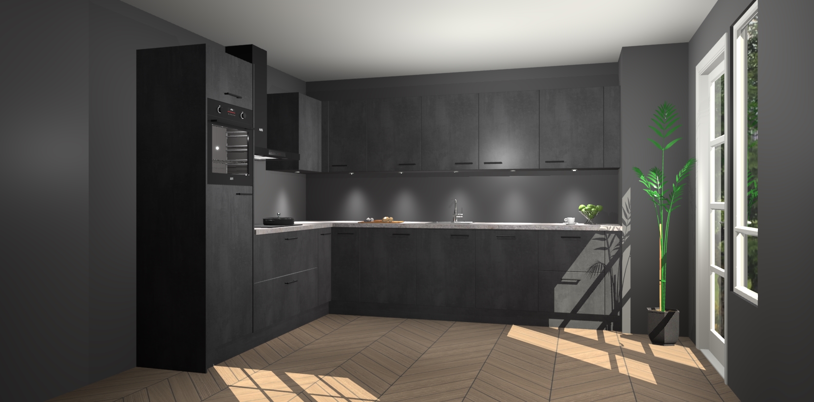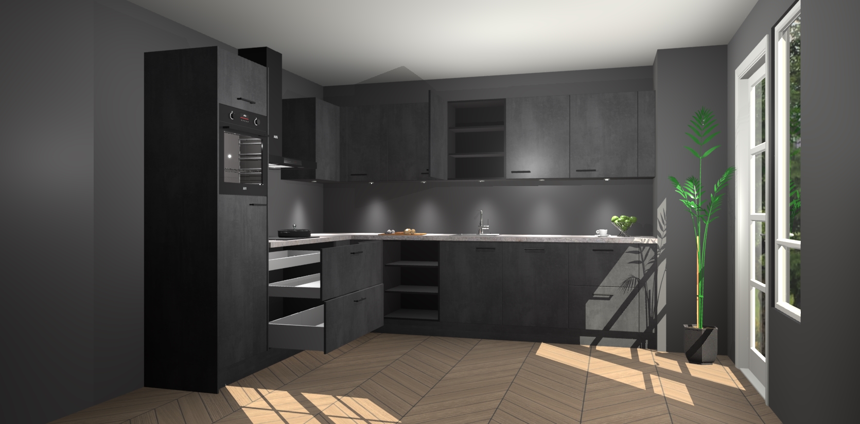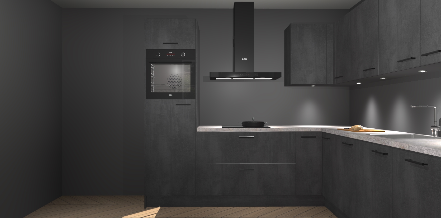 De Beton Zwarte keuken Debar is uitgerust met vijf inbouwapparaten die elke kooktaak handig en efficiënt maken. Een oven, inductiekookplaat, afzuigkap, vaatwasser en koelkast zijn standaard, maar kunnen na bestelling eenvoudig worden geupgrade naar AEG. Profiteer vervolgens van de softclose deuren voor snelle toegang en geruisloze toegang.