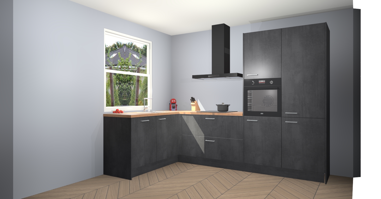 Met 5 ingebouwde apparaten waaronder een oven, inductiekookplaat, afzuigkap, vaatwasser en koelkast, bent u altijd goed geoutilleerd in uw keuken. Al deze apparaten kunnen worden geupgraded na het bestellen. De binnenzijde van de kast word gekleurd met een donkere kleur wat dit ontwerp nog interessanter maakt.