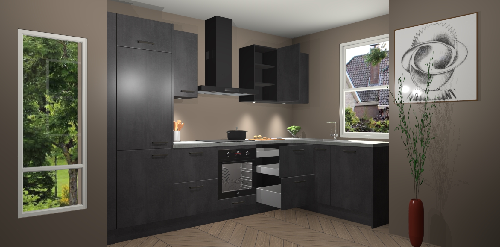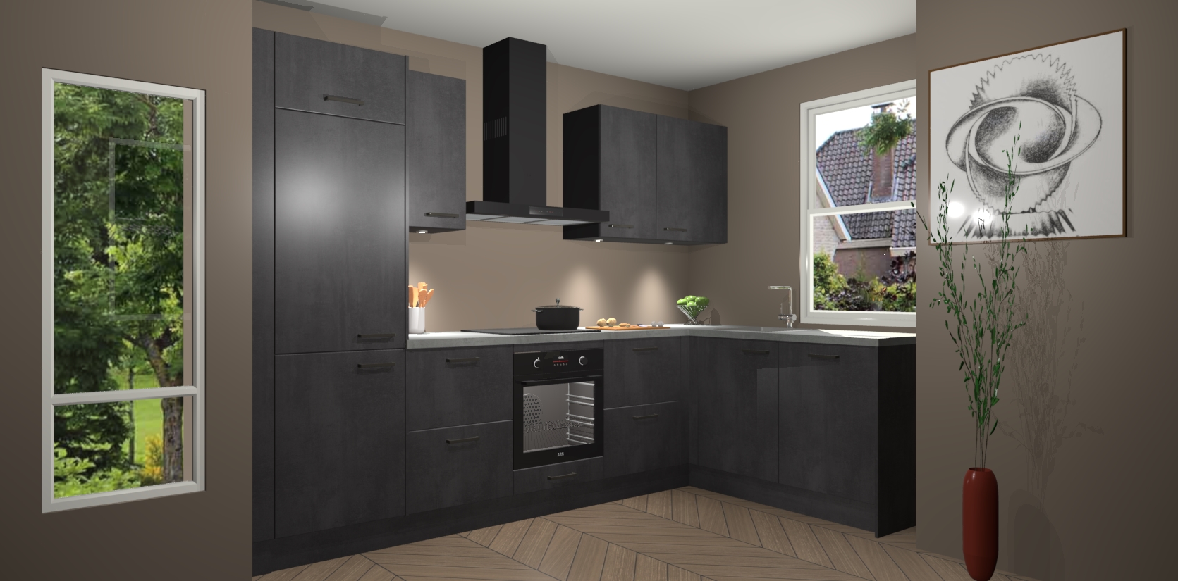 Bent u op zoek naar een moderne en tijdloze keuken die schoonheid in uw huis brengt? Zoek dan niet verder dan de Beton Zwarte keuken Geneve - de perfecte keuken voor al uw wensen. Deze hoekkeuken biedt de hoogste Duitse kwaliteit voor een vaste lage prijs en is zeker een blikvanger in uw huis!