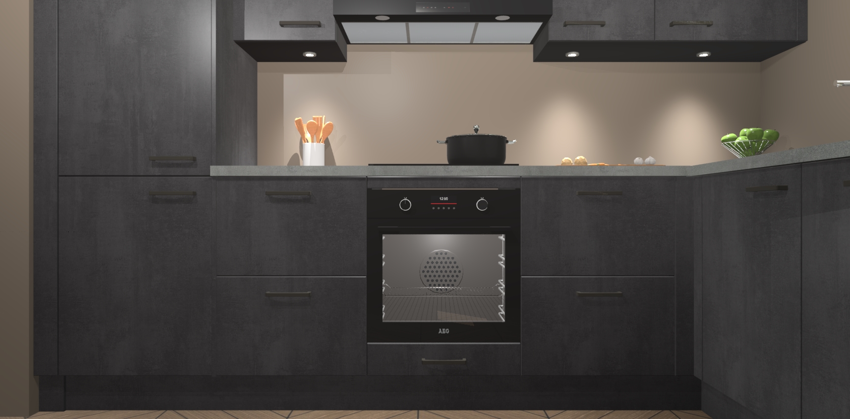 De Beton Zwarte keuken Geneve is uitgerust met 5 inbouwapparaten - een oven, inductiekookplaat, afzuigkap, vaatwasser en koelkast - voor al uw kook- en bewaarbehoeftes. U kunt deze apparaten desgewenst eenvoudig upgraden naar AEG of de oven omruilen voor een combimagnetron na het plaatsen van uw bestelling. En met de soft close deuren, voldoende opbergruimte en kasten die voorgemonteerd worden geleverd, bent u in een mum van tijd klaar om heerlijke maaltijden te bereiden!