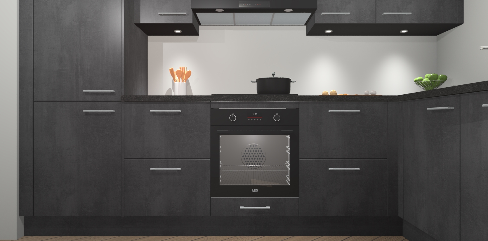De Beton Zwarte keuken Geneve is uitgerust met 5 inbouwapparaten - een oven, inductiekookplaat, afzuigkap, vaatwasser en koelkast - voor al uw kook- en bewaarbehoeftes. U kunt deze apparaten desgewenst eenvoudig upgraden naar AEG of de oven omruilen voor een combimagnetron na het plaatsen van uw bestelling. En met de soft close deuren, voldoende opbergruimte en kasten die voorgemonteerd worden geleverd, bent u in een mum van tijd klaar om heerlijke maaltijden te bereiden!