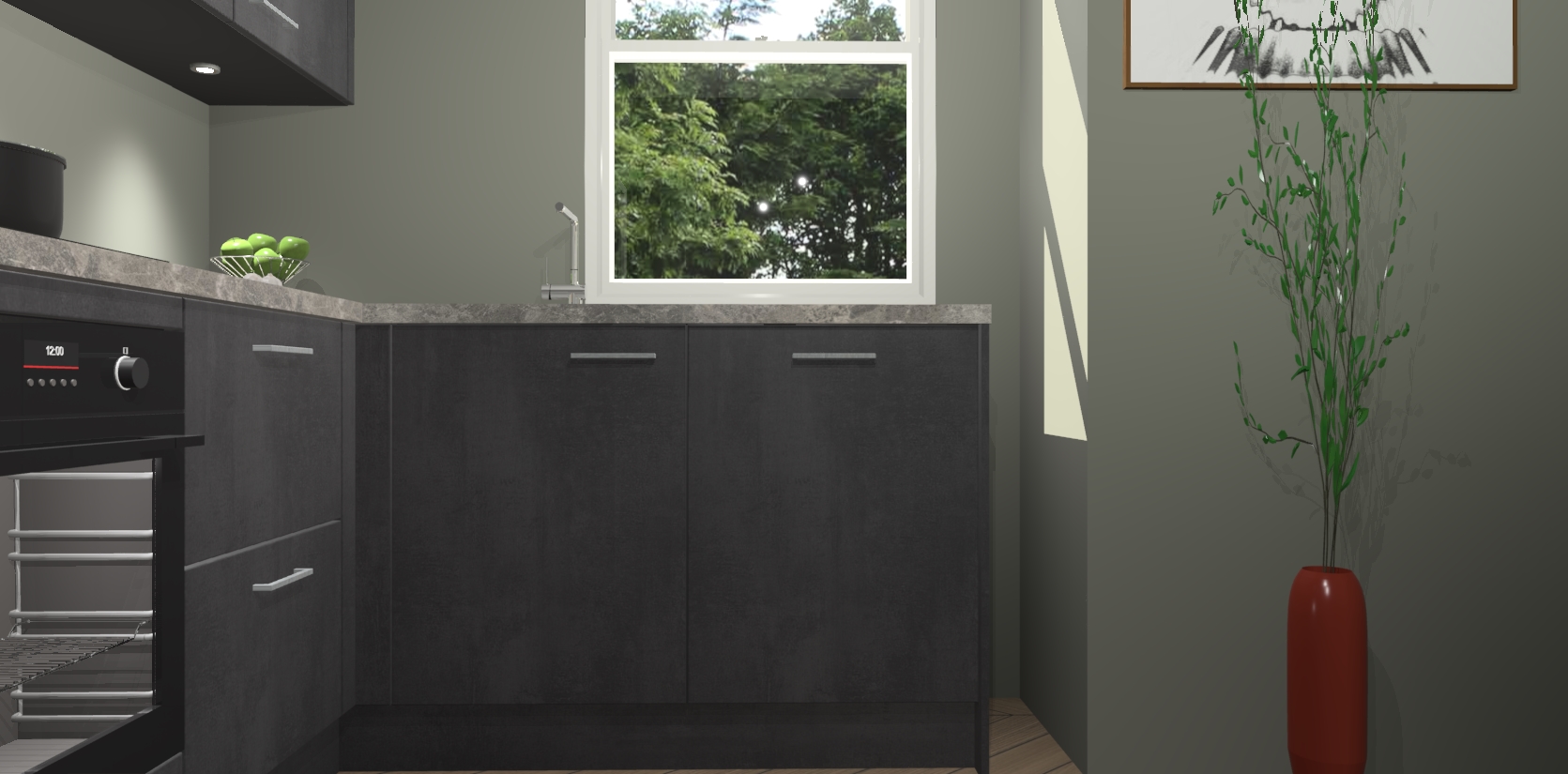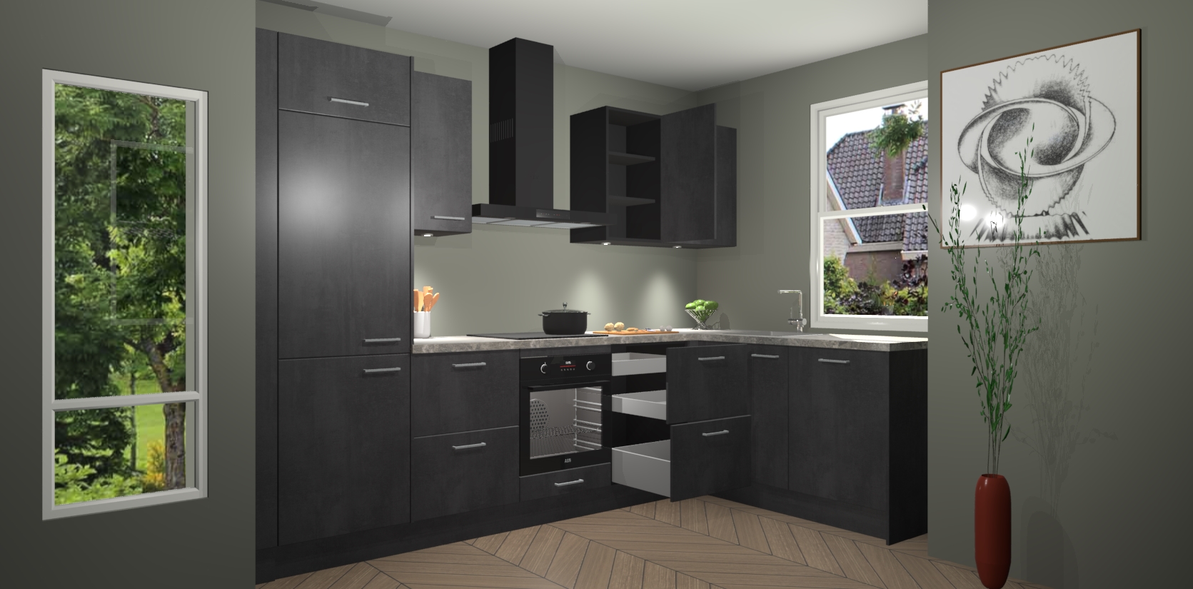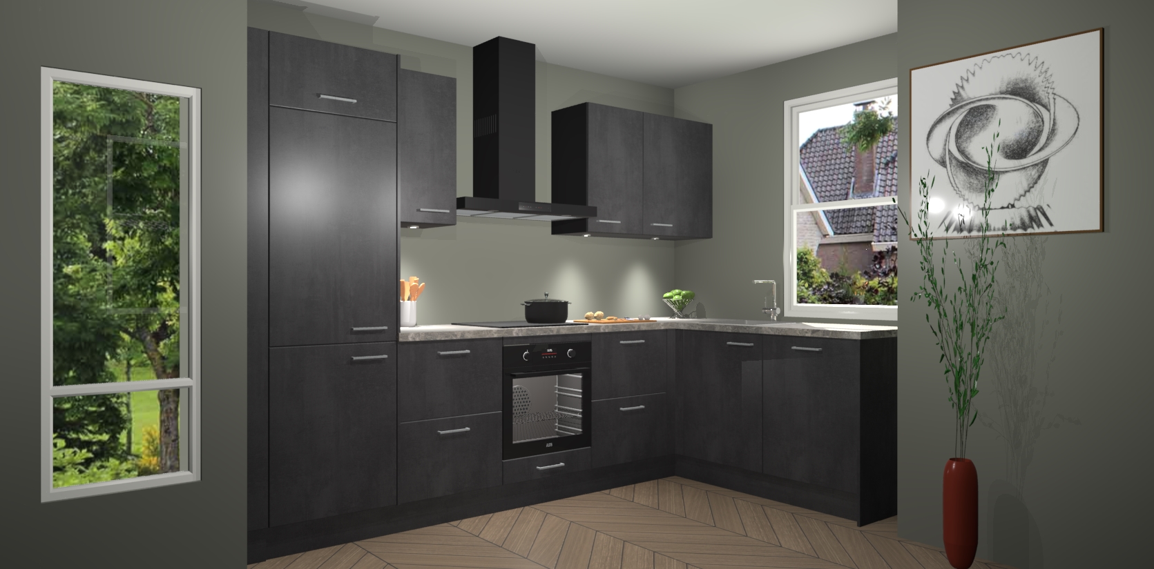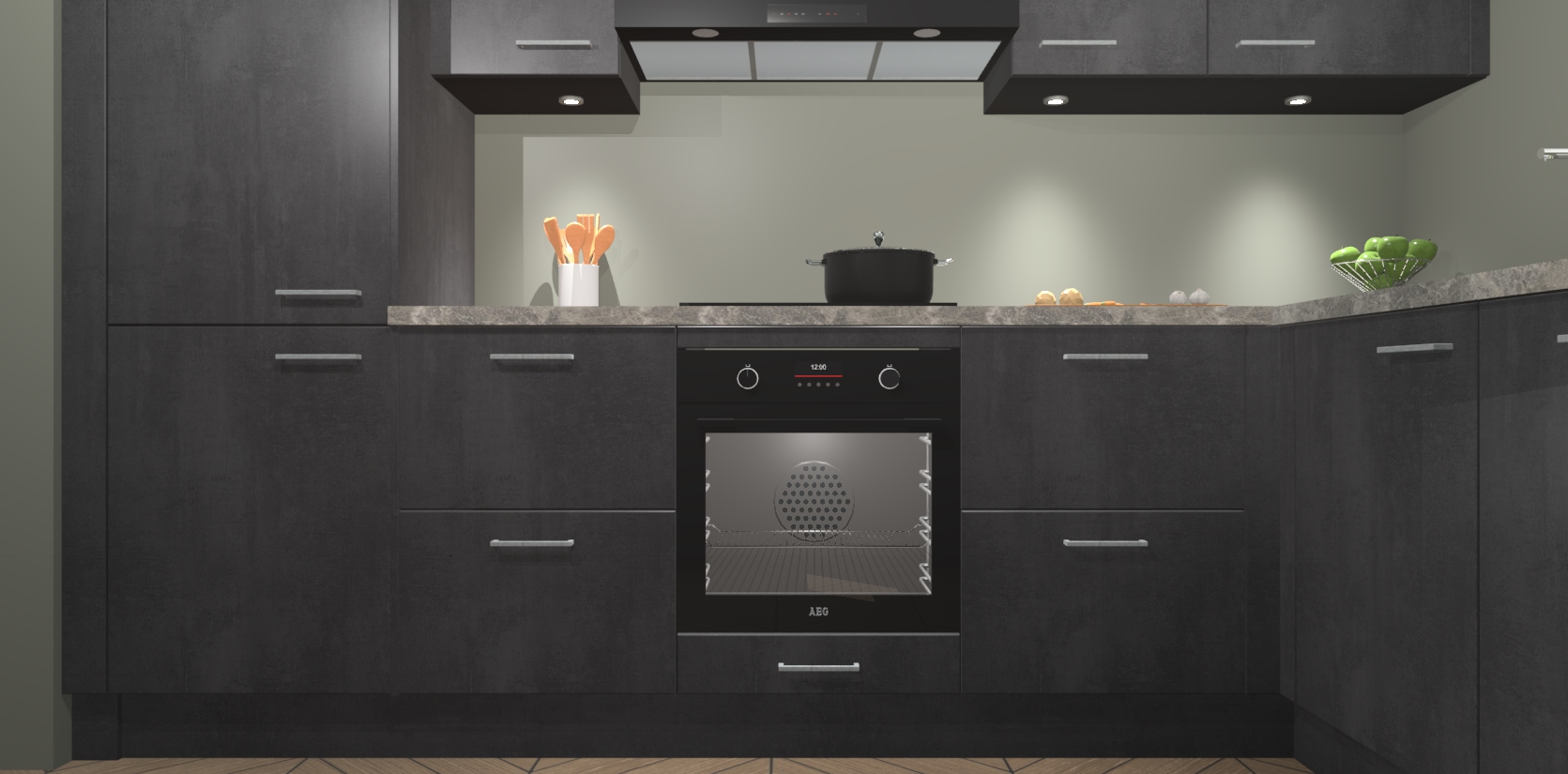 De Beton Zwarte keuken Geneve is uitgerust met 5 inbouwapparaten - een oven, inductiekookplaat, afzuigkap, vaatwasser en koelkast - voor al uw kook- en bewaarbehoeftes. U kunt deze apparaten desgewenst eenvoudig upgraden naar AEG of de oven omruilen voor een combimagnetron na het plaatsen van uw bestelling. En met de soft close deuren, voldoende opbergruimte en kasten die voorgemonteerd worden geleverd, bent u in een mum van tijd klaar om heerlijke maaltijden te bereiden!