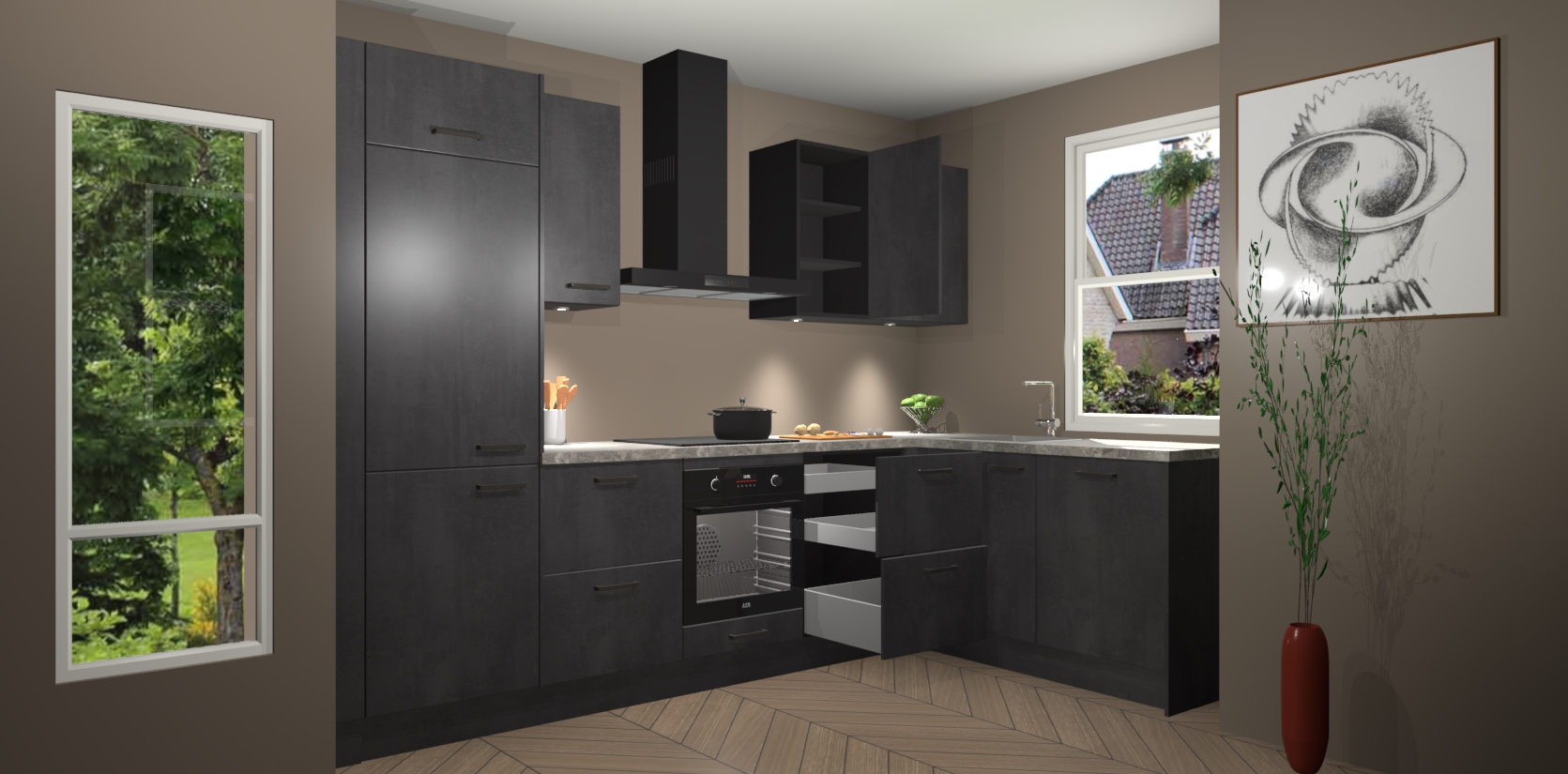 De Beton Zwarte keuken Geneve is uitgerust met 5 inbouwapparaten - een oven, inductiekookplaat, afzuigkap, vaatwasser en koelkast - voor al uw kook- en bewaarbehoeftes. U kunt deze apparaten desgewenst eenvoudig upgraden naar AEG of de oven omruilen voor een combimagnetron na het plaatsen van uw bestelling. En met de soft close deuren, voldoende opbergruimte en kasten die voorgemonteerd worden geleverd, bent u in een mum van tijd klaar om heerlijke maaltijden te bereiden!