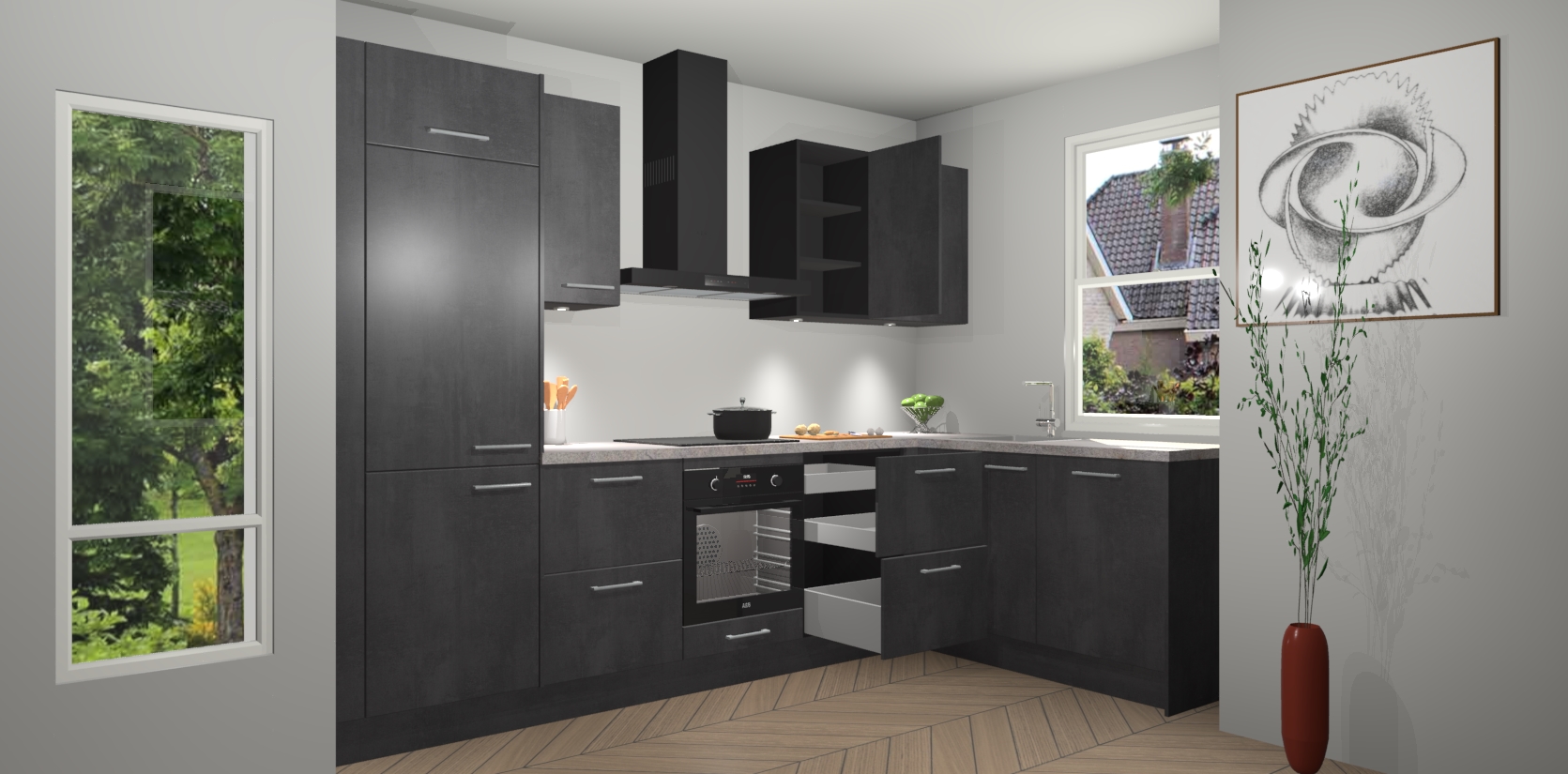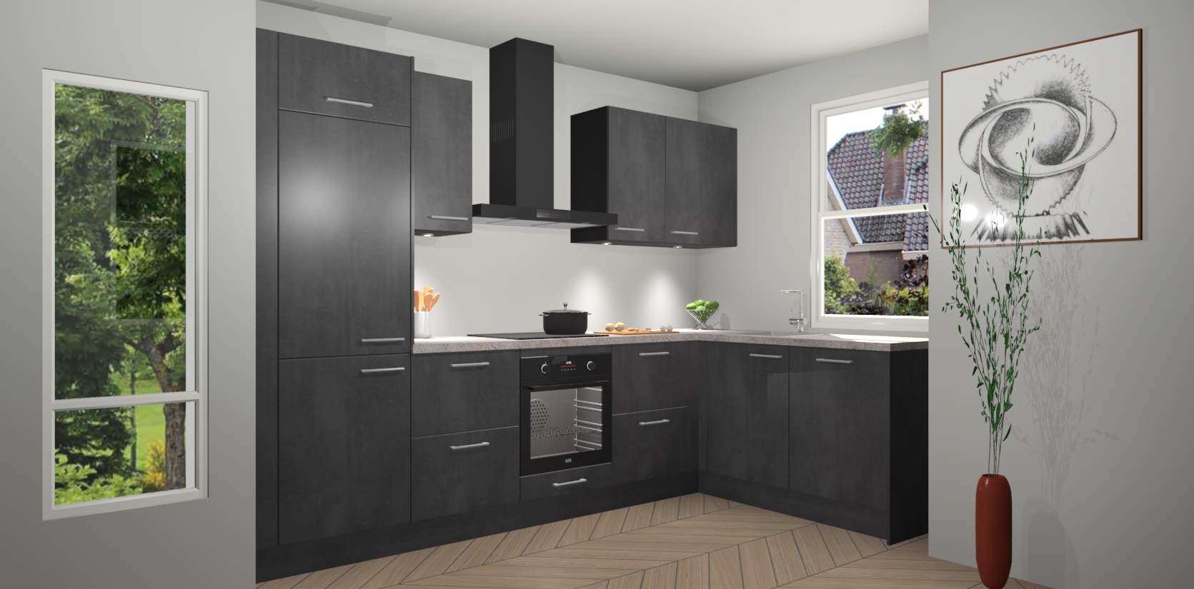 Bent u op zoek naar een moderne en tijdloze keuken die schoonheid in uw huis brengt? Zoek dan niet verder dan de Beton Zwarte keuken Geneve - de perfecte keuken voor al uw wensen. Deze hoekkeuken biedt de hoogste Duitse kwaliteit voor een vaste lage prijs en is zeker een blikvanger in uw huis!