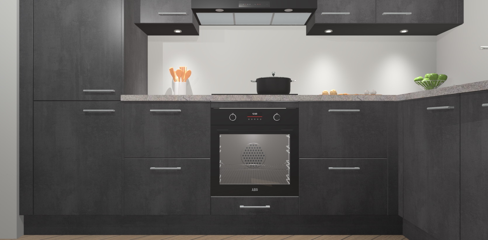 De Beton Zwarte keuken Geneve is uitgerust met 5 inbouwapparaten - een oven, inductiekookplaat, afzuigkap, vaatwasser en koelkast - voor al uw kook- en bewaarbehoeftes. U kunt deze apparaten desgewenst eenvoudig upgraden naar AEG of de oven omruilen voor een combimagnetron na het plaatsen van uw bestelling. En met de soft close deuren, voldoende opbergruimte en kasten die voorgemonteerd worden geleverd, bent u in een mum van tijd klaar om heerlijke maaltijden te bereiden!