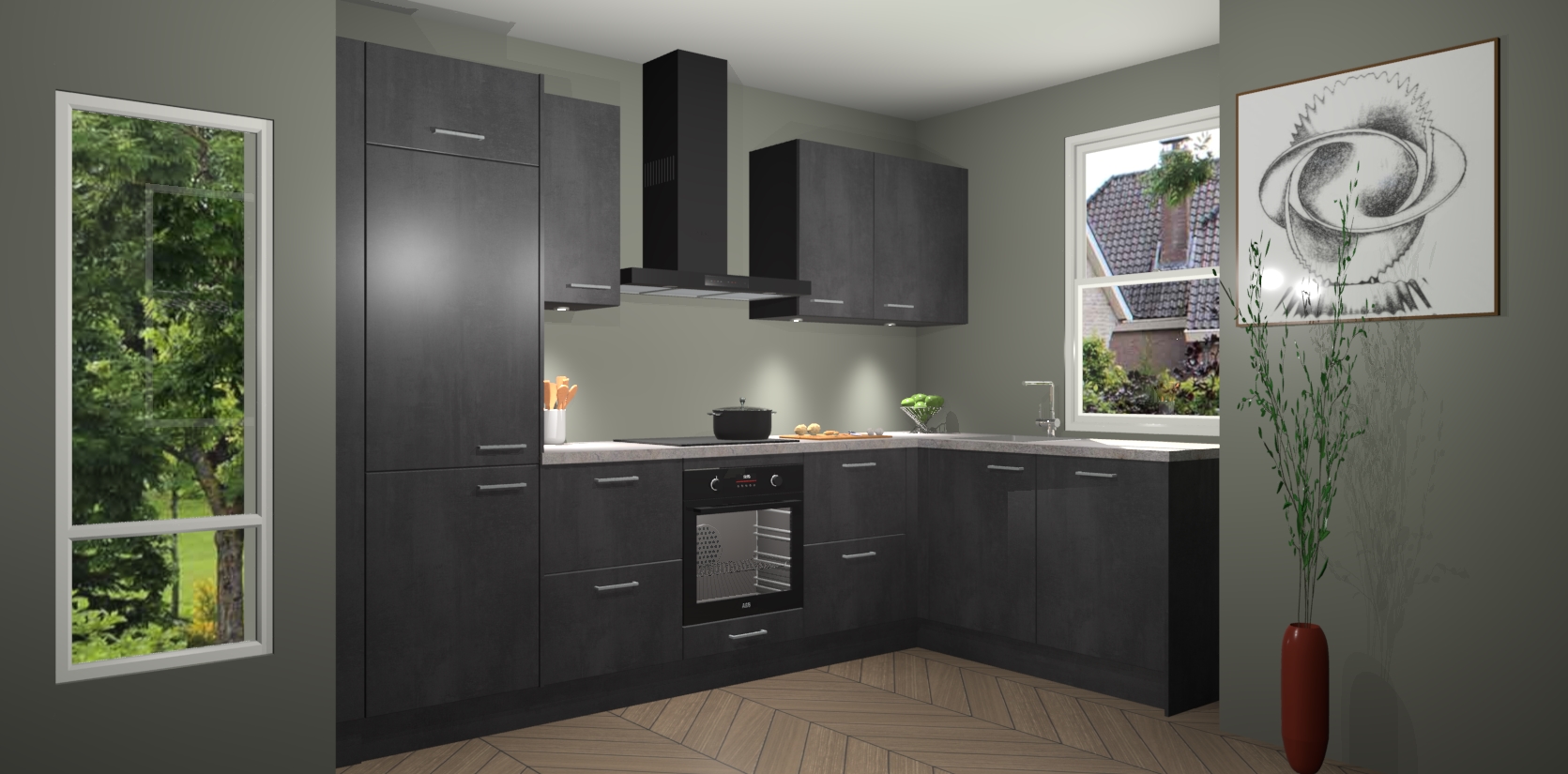 Bent u op zoek naar een moderne en tijdloze keuken die schoonheid in uw huis brengt? Zoek dan niet verder dan de Beton Zwarte keuken Geneve - de perfecte keuken voor al uw wensen. Deze hoekkeuken biedt de hoogste Duitse kwaliteit voor een vaste lage prijs en is zeker een blikvanger in uw huis!
