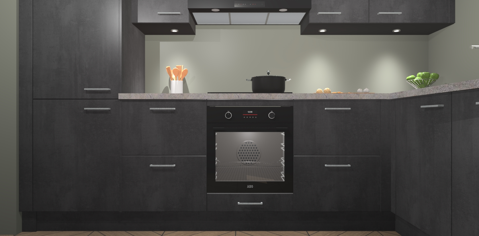 De Beton Zwarte keuken Geneve is uitgerust met 5 inbouwapparaten - een oven, inductiekookplaat, afzuigkap, vaatwasser en koelkast - voor al uw kook- en bewaarbehoeftes. U kunt deze apparaten desgewenst eenvoudig upgraden naar AEG of de oven omruilen voor een combimagnetron na het plaatsen van uw bestelling. En met de soft close deuren, voldoende opbergruimte en kasten die voorgemonteerd worden geleverd, bent u in een mum van tijd klaar om heerlijke maaltijden te bereiden!