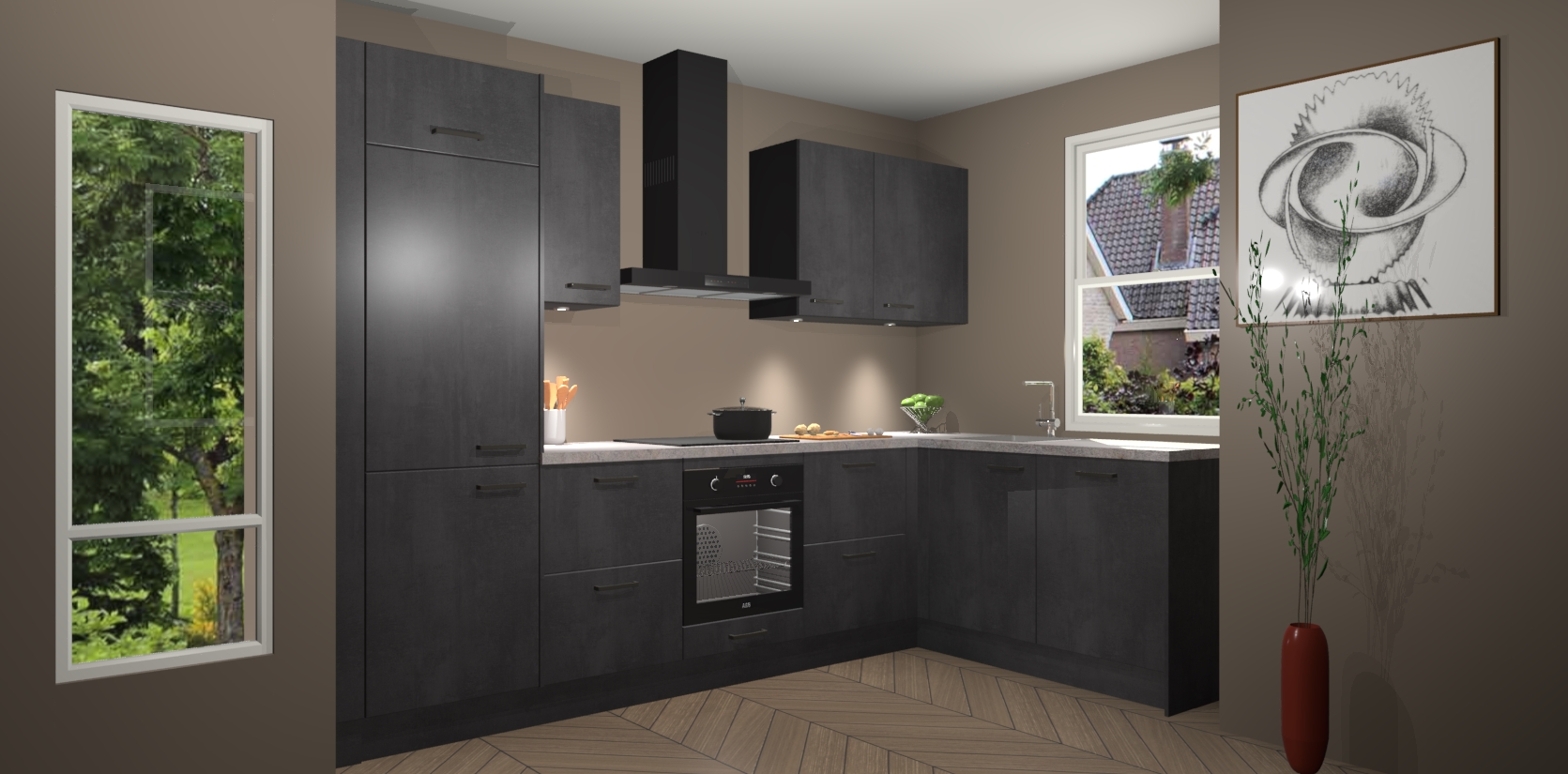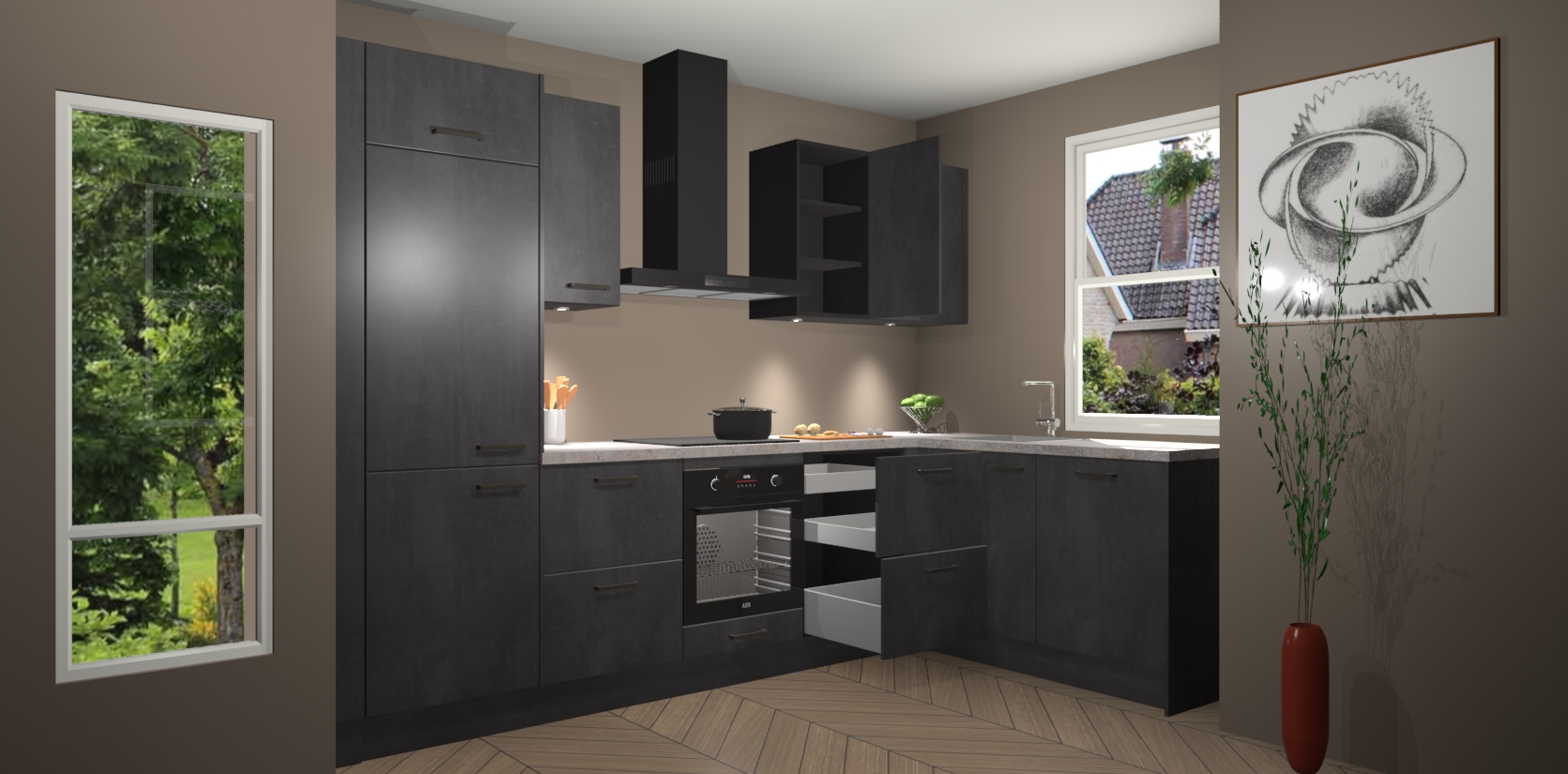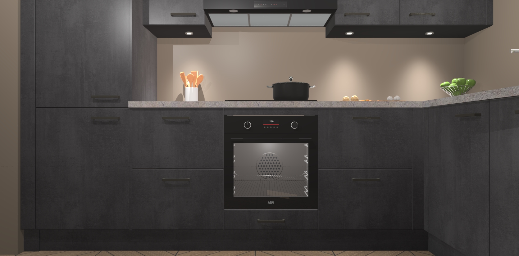 De Beton Zwarte keuken Geneve is uitgerust met 5 inbouwapparaten - een oven, inductiekookplaat, afzuigkap, vaatwasser en koelkast - voor al uw kook- en bewaarbehoeftes. U kunt deze apparaten desgewenst eenvoudig upgraden naar AEG of de oven omruilen voor een combimagnetron na het plaatsen van uw bestelling. En met de soft close deuren, voldoende opbergruimte en kasten die voorgemonteerd worden geleverd, bent u in een mum van tijd klaar om heerlijke maaltijden te bereiden!