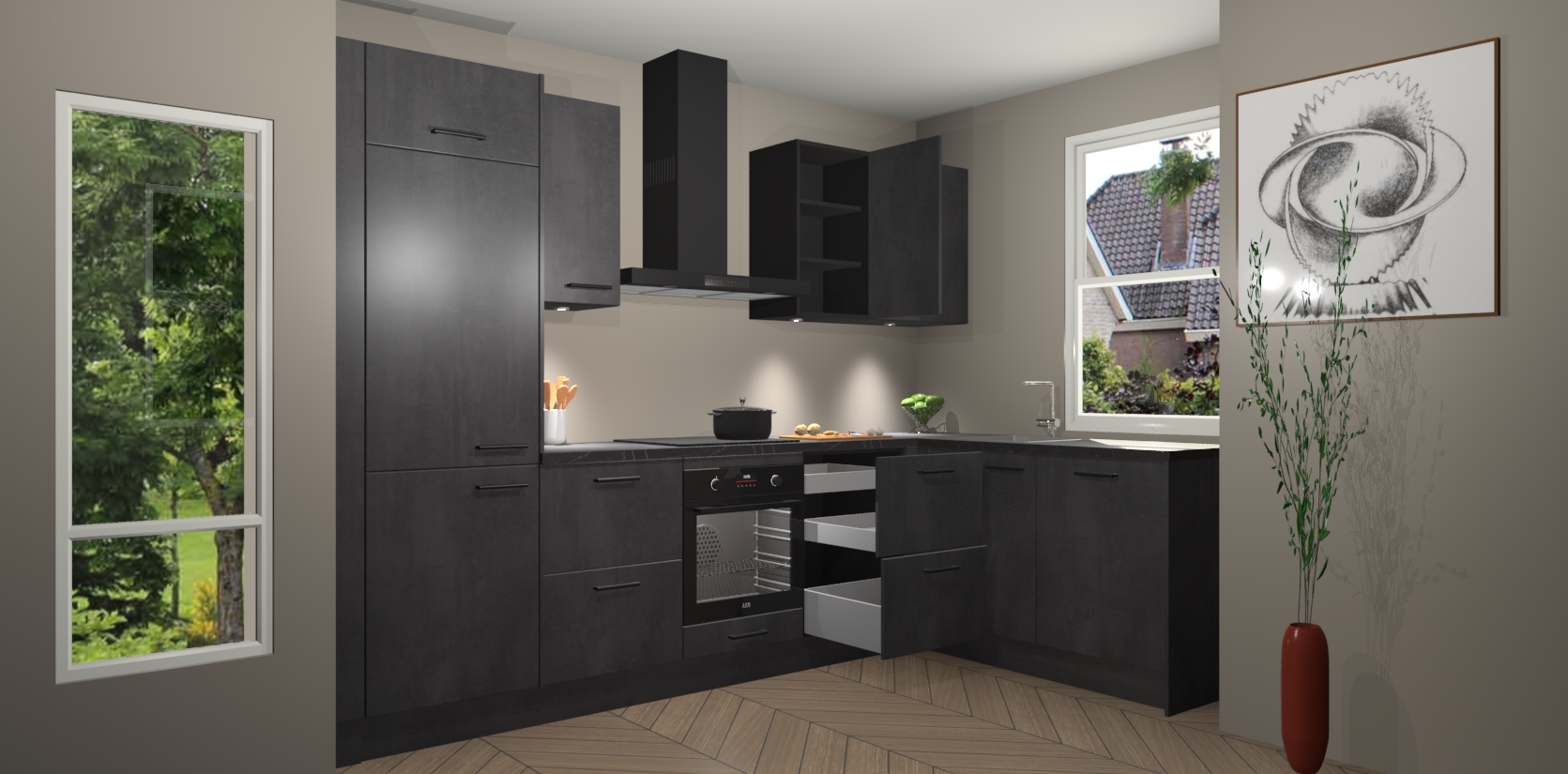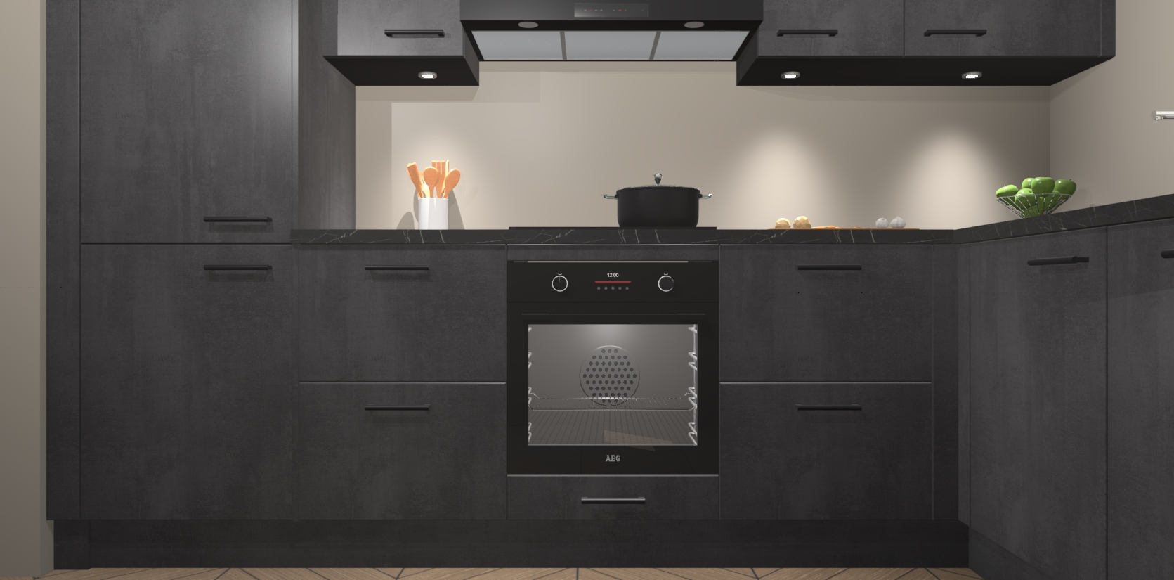 De Beton Zwarte keuken Geneve is uitgerust met 5 inbouwapparaten - een oven, inductiekookplaat, afzuigkap, vaatwasser en koelkast - voor al uw kook- en bewaarbehoeftes. U kunt deze apparaten desgewenst eenvoudig upgraden naar AEG of de oven omruilen voor een combimagnetron na het plaatsen van uw bestelling. En met de soft close deuren, voldoende opbergruimte en kasten die voorgemonteerd worden geleverd, bent u in een mum van tijd klaar om heerlijke maaltijden te bereiden!