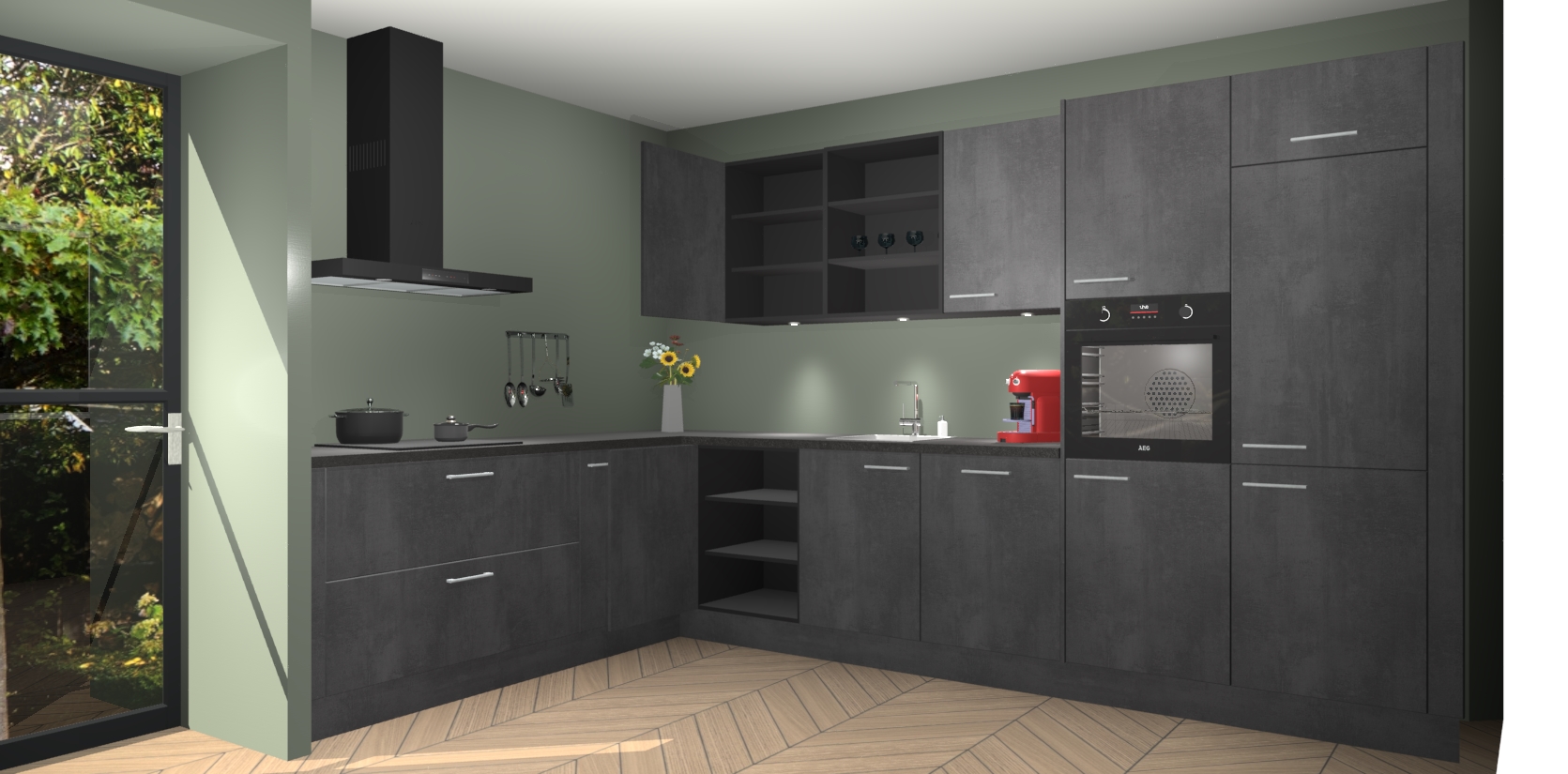 Met veel plezier introduceren we de beton zwarte keuken Gotenburg - een prachtig pronkstuk dat een moderne en elegante look in uw keuken creëert. De buitenkant heeft een betonlook die luxe uitstraalt, terwijl de binnenkant van de kasten dezelfde donkere tint heeft. Deze combinatie geeft uw keuken een buitengewone sfeer!