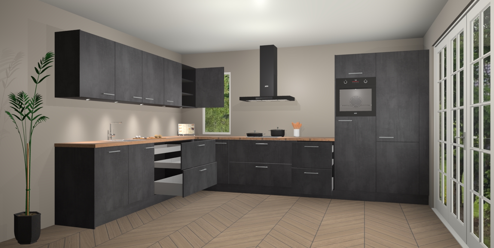 Heeft u nog apparatuur nodig? Geen probleem: de beton zwarte keuken Harare bevat vijf ingebouwde apparaten - een oven, inductiekookplaat, afzuigkap, vaatwasser en koelkast - die gemakkelijk kunnen worden bijgewerkt naar AEG na bestelling. En als dat nog niet genoeg is; onze kasten worden pre-geassembleerd geleverd en zijn verkrijgbaar tegen een vastgeroeste lage prijs! U hoeft nooit meer te zoeken naar goede kwaliteit en service want onze producten hebben echt Duitse kwaliteit.