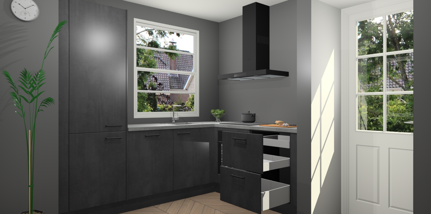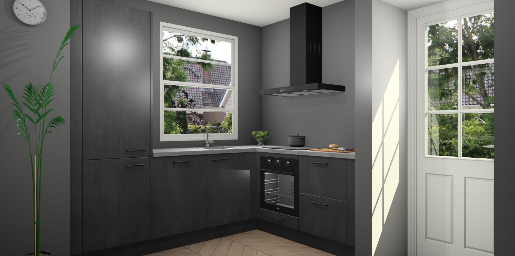 Wilt u een echte aanwinst voor uw keuken, maar bent u op zoek naar iets specialers dan de standaardkeukens? Kies dan voor de Beton Zwarte keuken Harbin! Dit prachtige hoekkeukenontwerp geeft u alle ruimte om optimaal te genieten van heerlijk koken. Het uitmuntende afwerkingsniveau, de fraaie houtstructuur en de sfeervolle zwarte grepen maken van de Beton Zwarte keuken Harbin de perfecte keuze voor zowel enthousiaste thuiskoks als design-minded interieurliefhebbers.