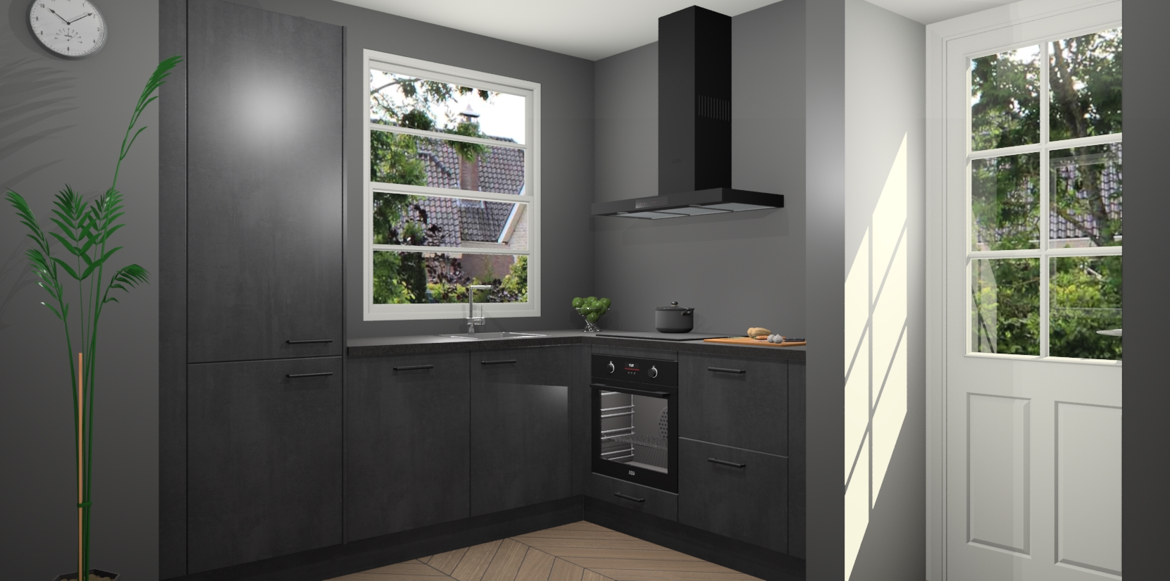 Plus: de Beton Zwarte keuken Harbin is kant en klaar voorzien van 5 inbouwapparaten. U krijgt er direct bij: een oven, inductiekookplaat, afzuigkap, vaatwasser én koelkast. En als dat nog niet luxueus genoeg is, heeft u nog de mogelijkheid om de apparaten te upgraden naar AEG of om uw oven te vervangen door een combimagnetron. Ook fijn van voordeel zijn de softclosing-deuren die ervoor zorgen dat u geen geluid hoeft te maken wanneer u weer uw koelkastdeurtjes dichtdoet!