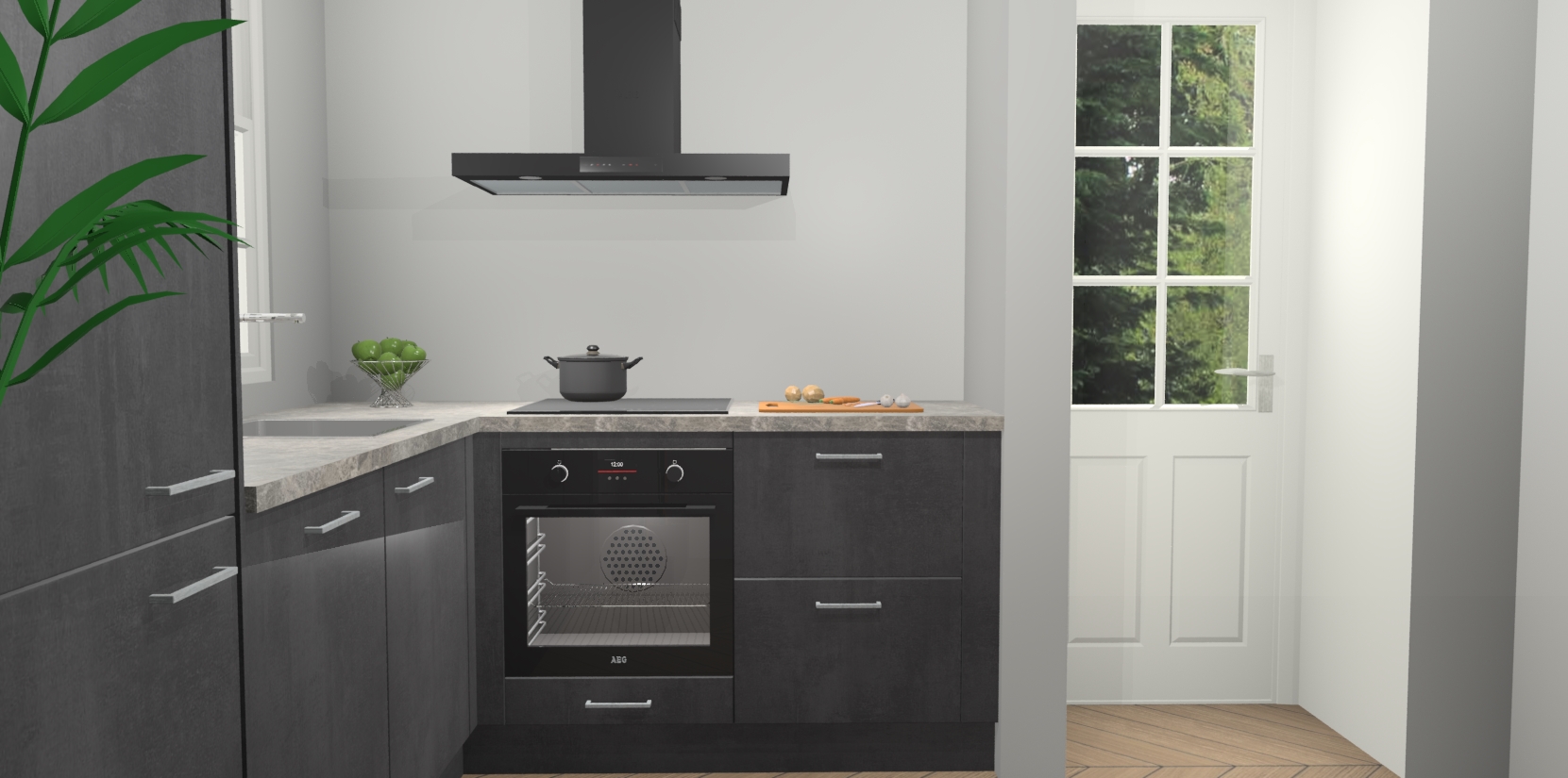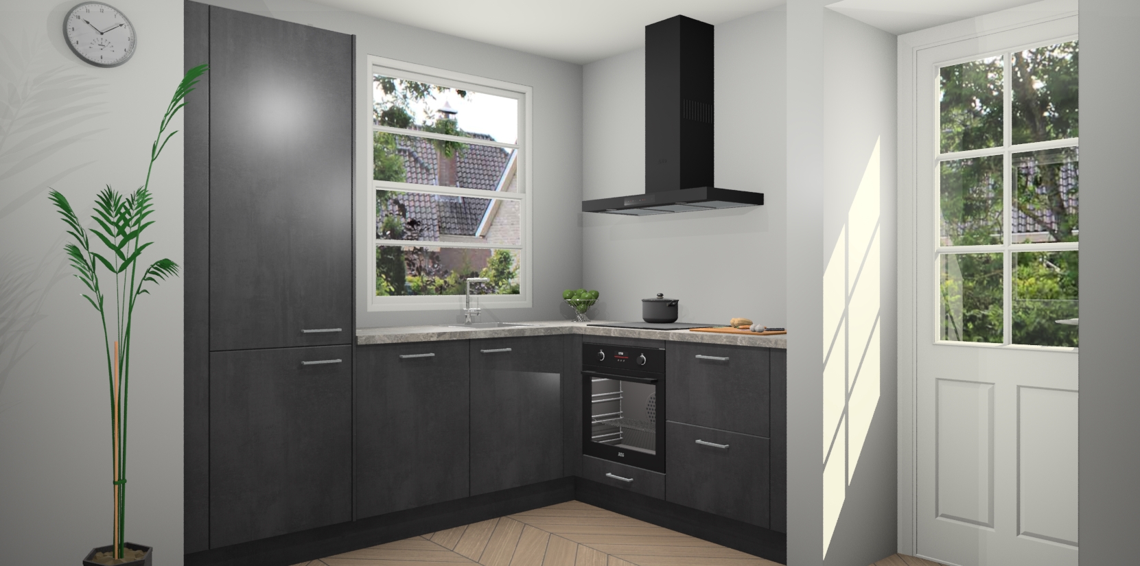 Plus: de Beton Zwarte keuken Harbin is kant en klaar voorzien van 5 inbouwapparaten. U krijgt er direct bij: een oven, inductiekookplaat, afzuigkap, vaatwasser én koelkast. En als dat nog niet luxueus genoeg is, heeft u nog de mogelijkheid om de apparaten te upgraden naar AEG of om uw oven te vervangen door een combimagnetron. Ook fijn van voordeel zijn de softclosing-deuren die ervoor zorgen dat u geen geluid hoeft te maken wanneer u weer uw koelkastdeurtjes dichtdoet!