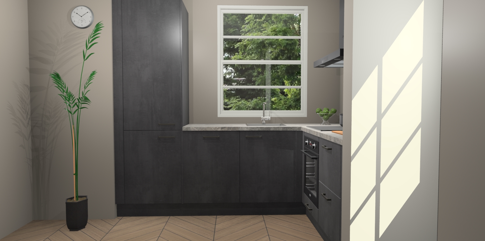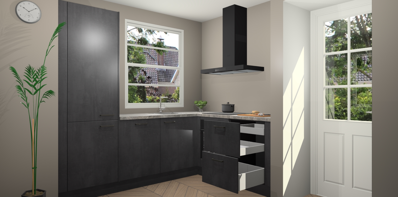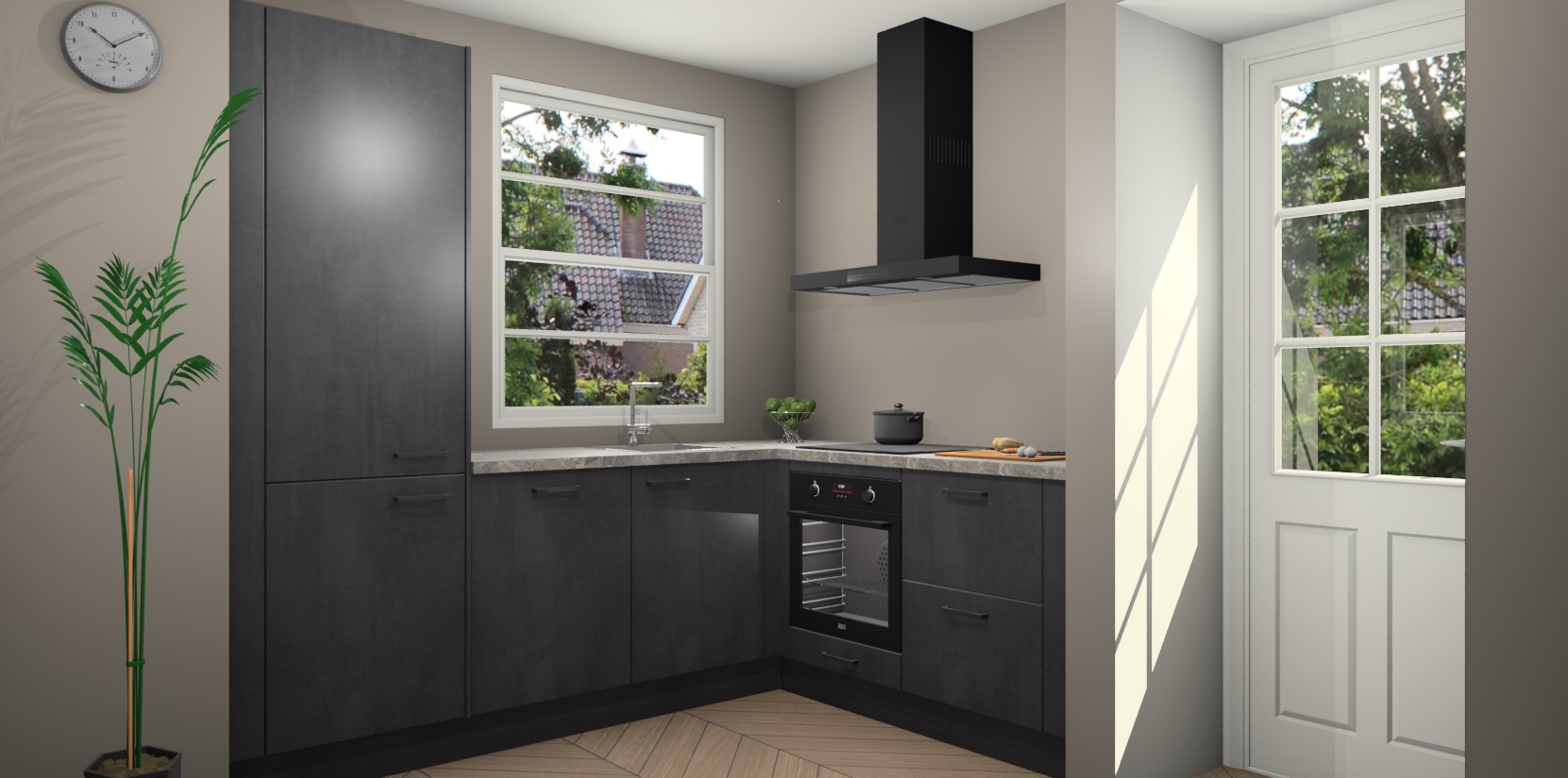 Wilt u een echte aanwinst voor uw keuken, maar bent u op zoek naar iets specialers dan de standaardkeukens? Kies dan voor de Beton Zwarte keuken Harbin! Dit prachtige hoekkeukenontwerp geeft u alle ruimte om optimaal te genieten van heerlijk koken. Het uitmuntende afwerkingsniveau, de fraaie houtstructuur en de sfeervolle zwarte grepen maken van de Beton Zwarte keuken Harbin de perfecte keuze voor zowel enthousiaste thuiskoks als design-minded interieurliefhebbers.