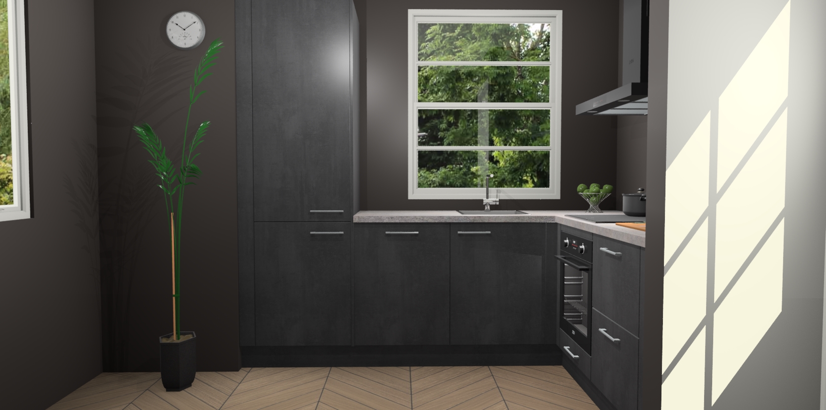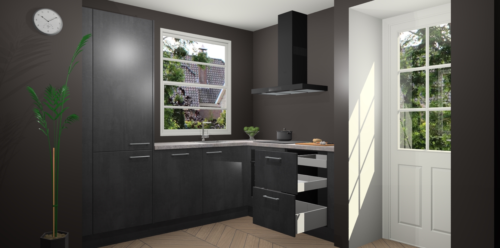 Wilt u een echte aanwinst voor uw keuken, maar bent u op zoek naar iets specialers dan de standaardkeukens? Kies dan voor de Beton Zwarte keuken Harbin! Dit prachtige hoekkeukenontwerp geeft u alle ruimte om optimaal te genieten van heerlijk koken. Het uitmuntende afwerkingsniveau, de fraaie houtstructuur en de sfeervolle zwarte grepen maken van de Beton Zwarte keuken Harbin de perfecte keuze voor zowel enthousiaste thuiskoks als design-minded interieurliefhebbers.