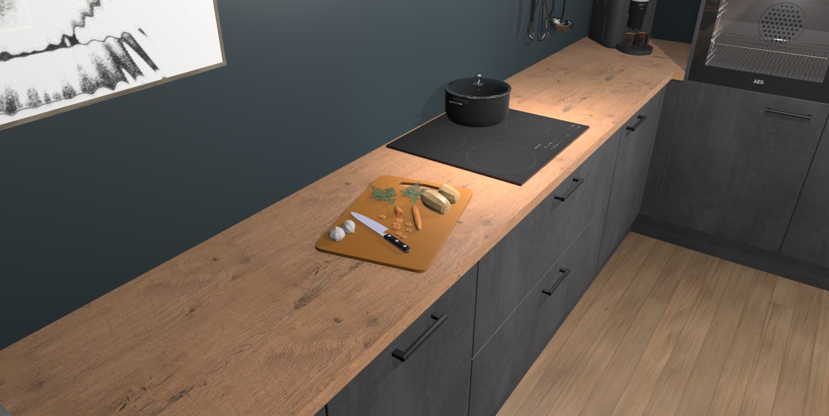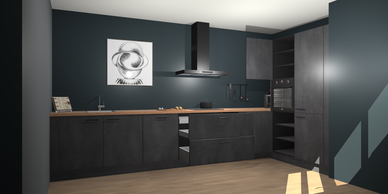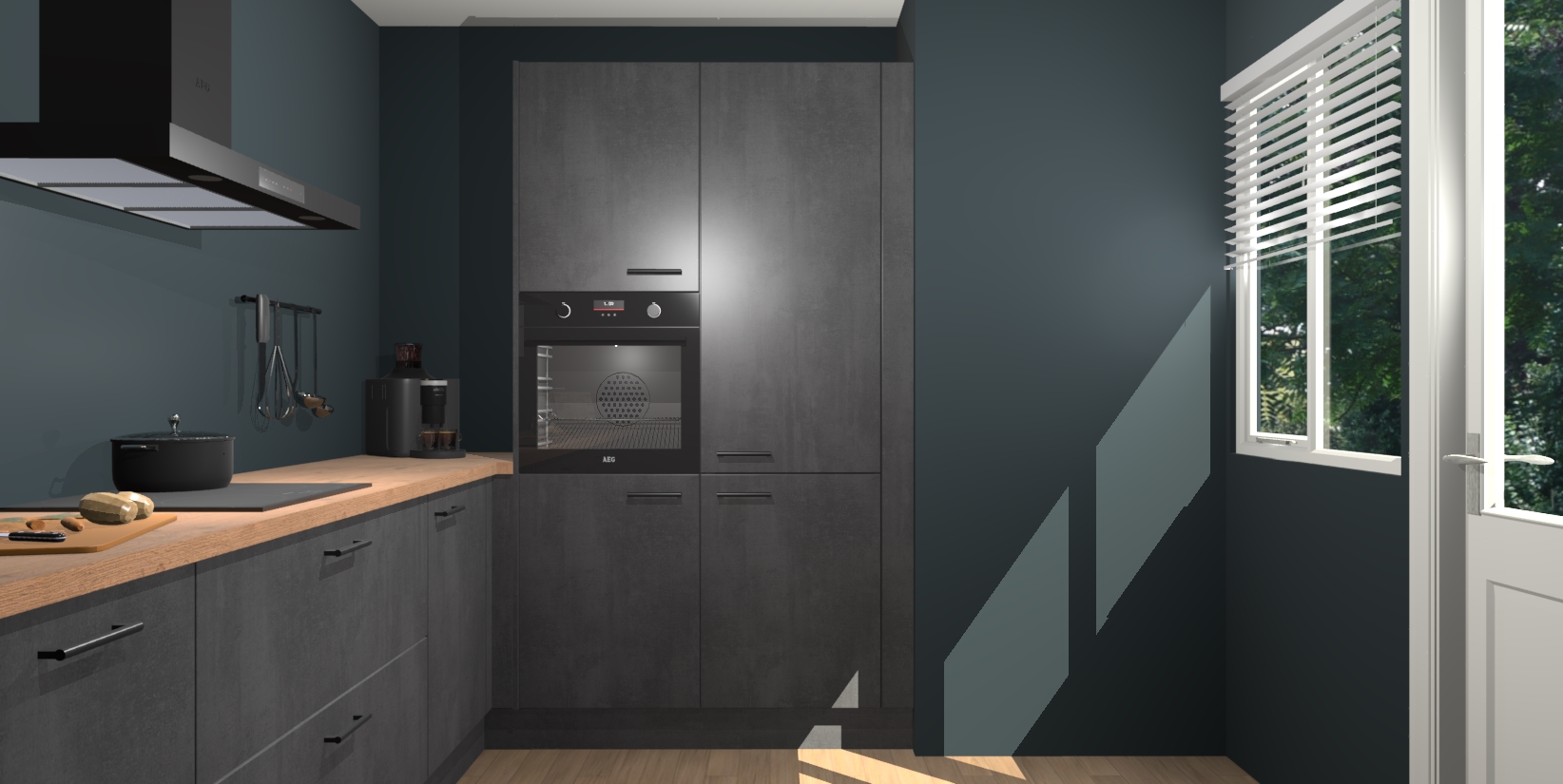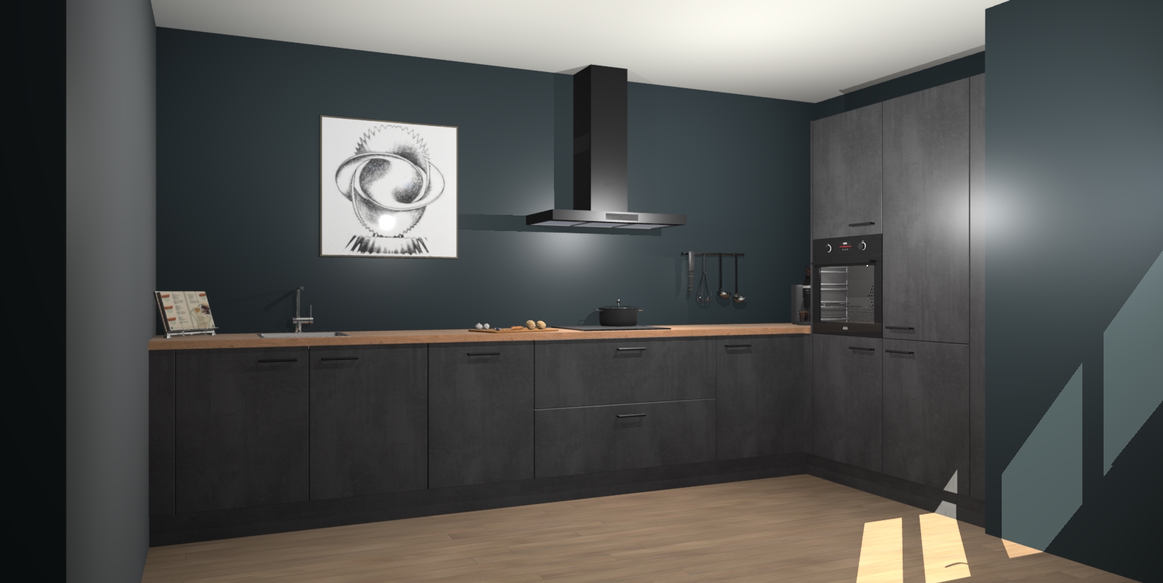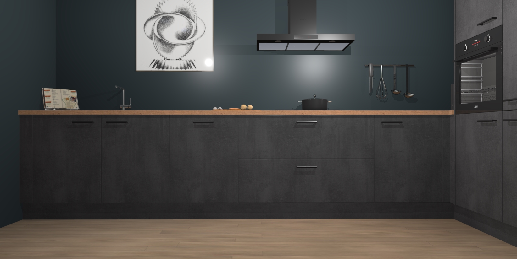 Welkom bij de Beton Zwarte keuken Khao Lak. Deze prachtige keuken zal de komende jaren het middelpunt van de belangstelling in uw huis zijn. Uitgerust met vijf inbouwapparaten komt u nooit kookgereedschap tekort. Bovendien geeft de warme houtlook elke ruimte een uitnodigende en tijdloze uitstraling.