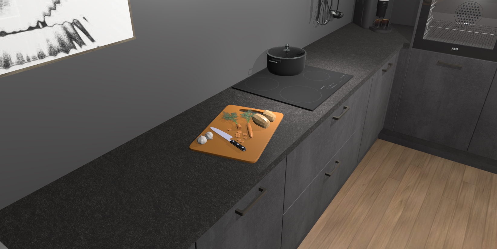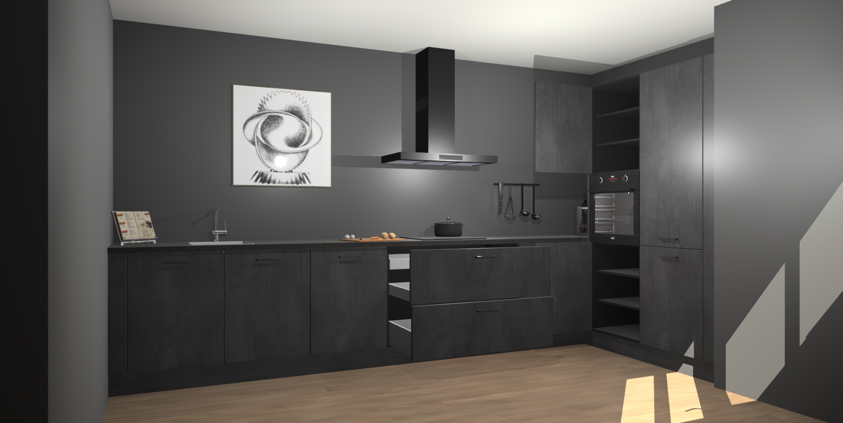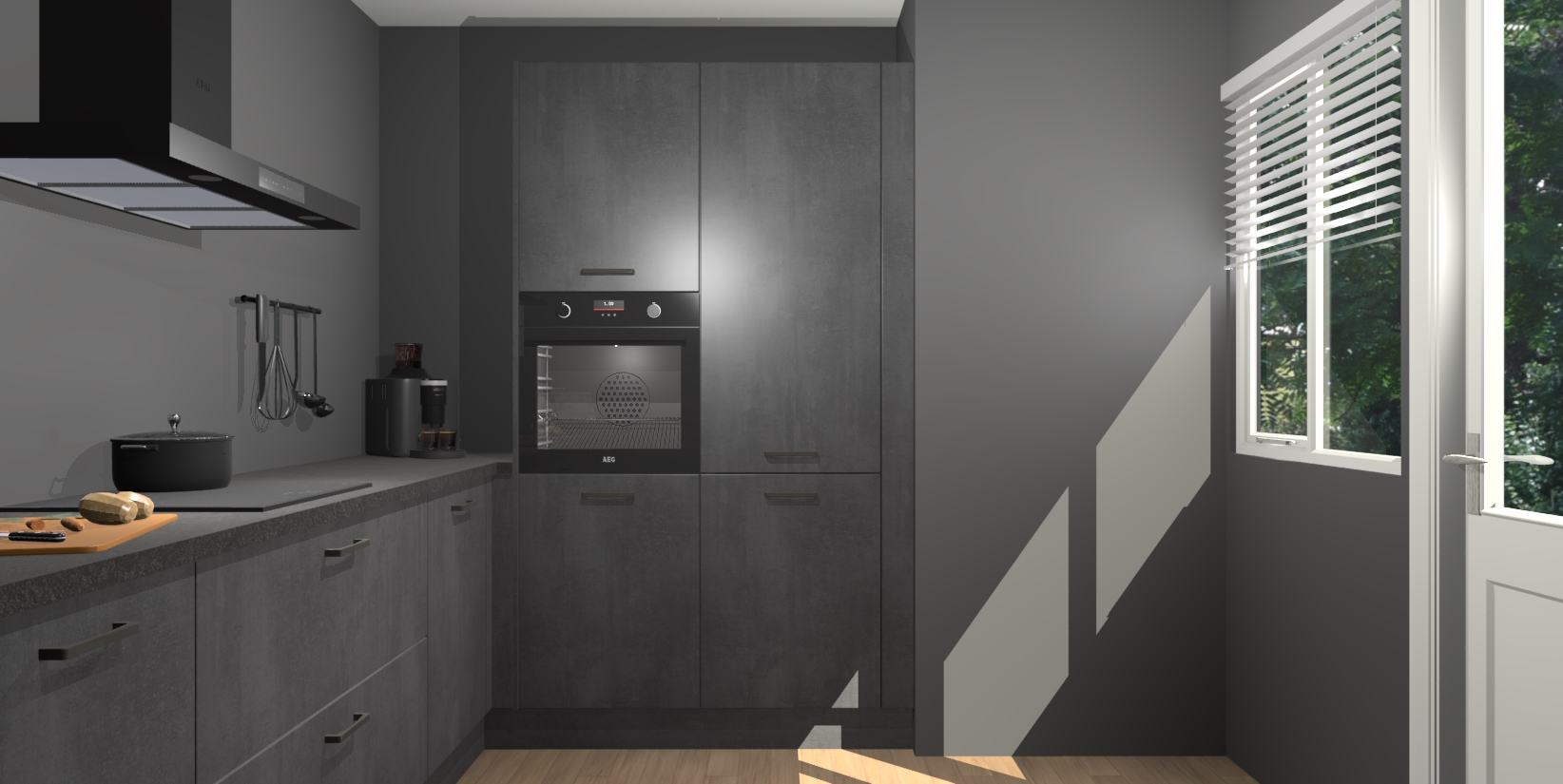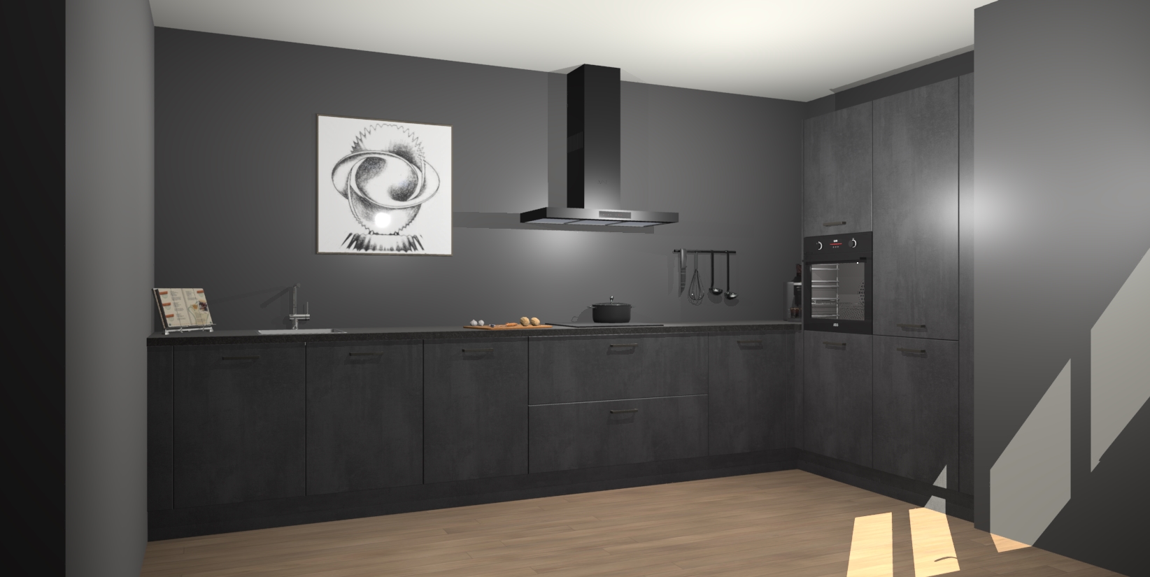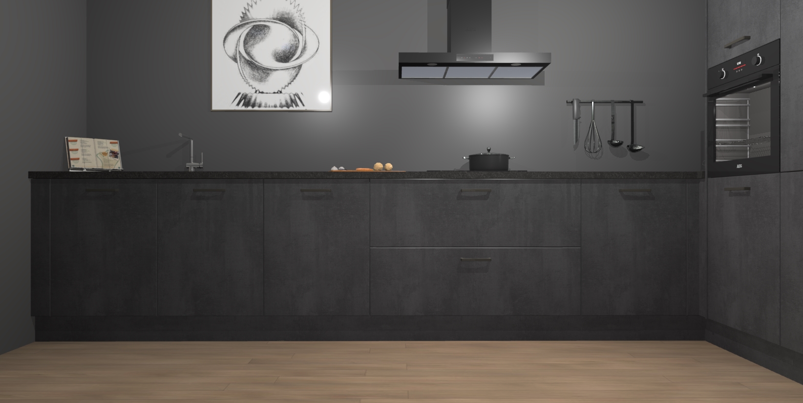 Welkom bij de Beton Zwarte keuken Khao Lak. Deze prachtige keuken zal de komende jaren het middelpunt van de belangstelling in uw huis zijn. Uitgerust met vijf inbouwapparaten komt u nooit kookgereedschap tekort. Bovendien geeft de warme houtlook elke ruimte een uitnodigende en tijdloze uitstraling.
