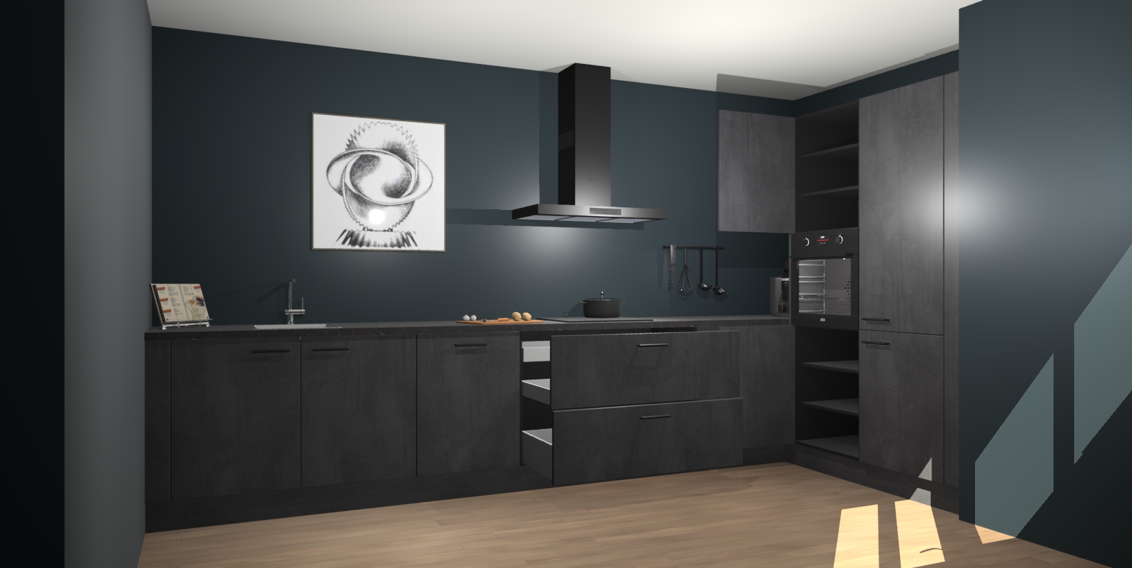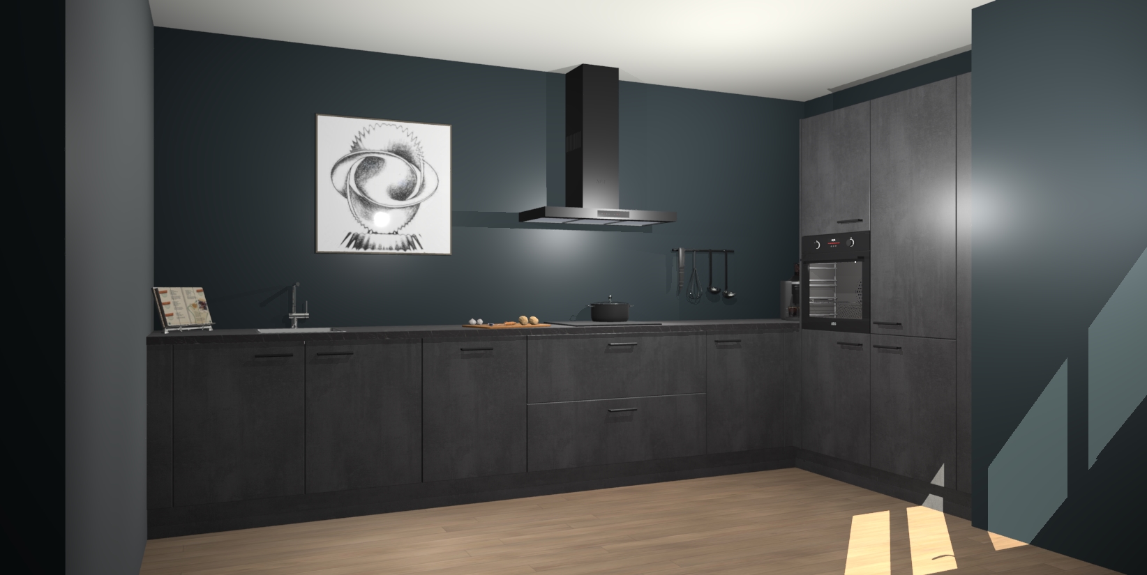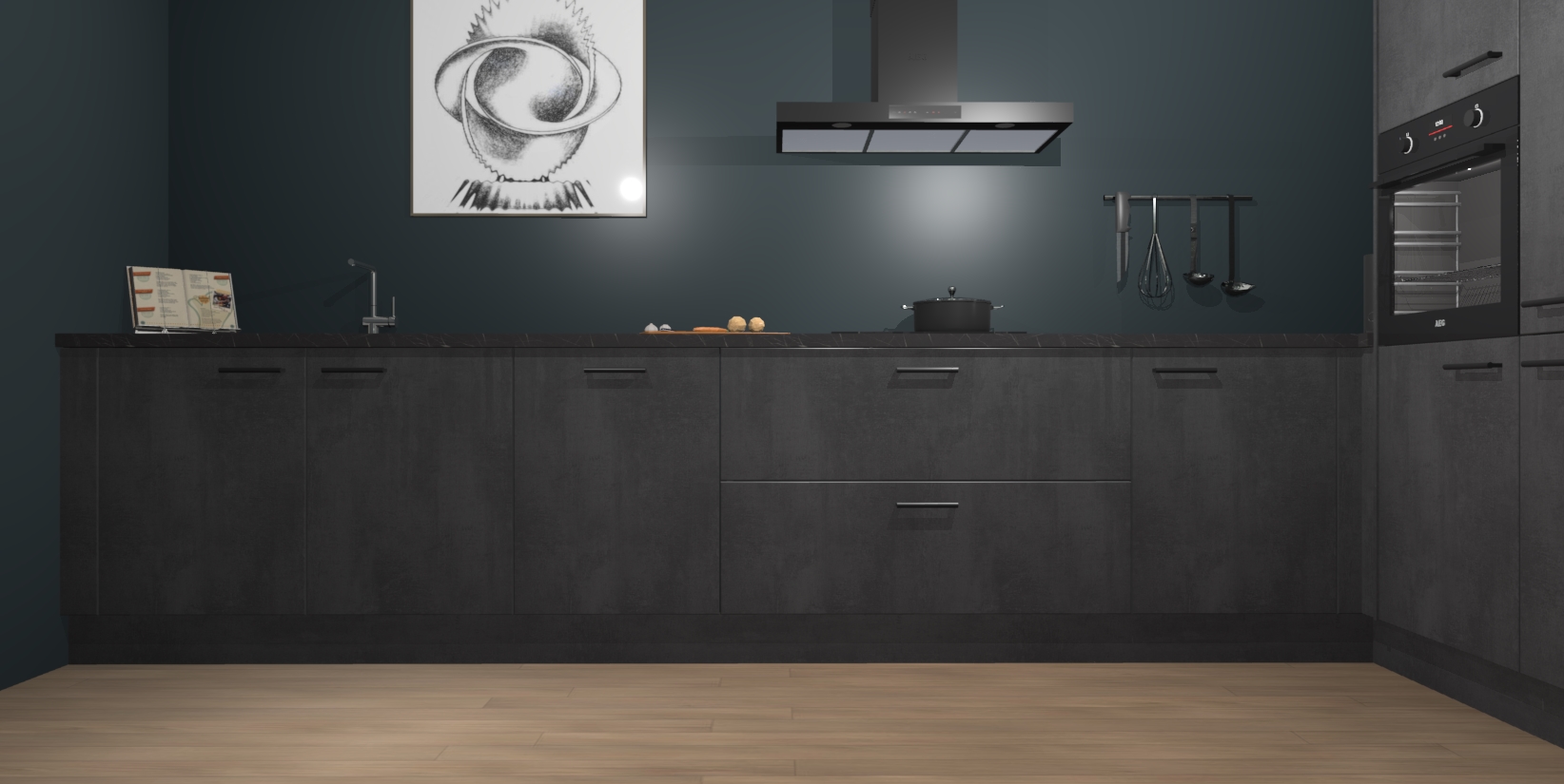 Welkom bij de Beton Zwarte keuken Khao Lak. Deze prachtige keuken zal de komende jaren het middelpunt van de belangstelling in uw huis zijn. Uitgerust met vijf inbouwapparaten komt u nooit kookgereedschap tekort. Bovendien geeft de warme houtlook elke ruimte een uitnodigende en tijdloze uitstraling.