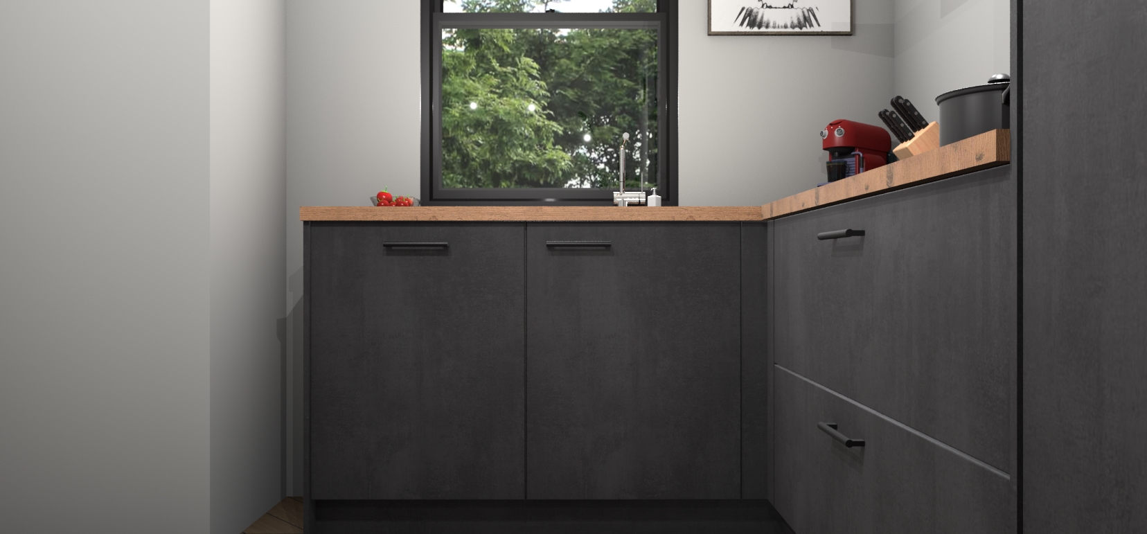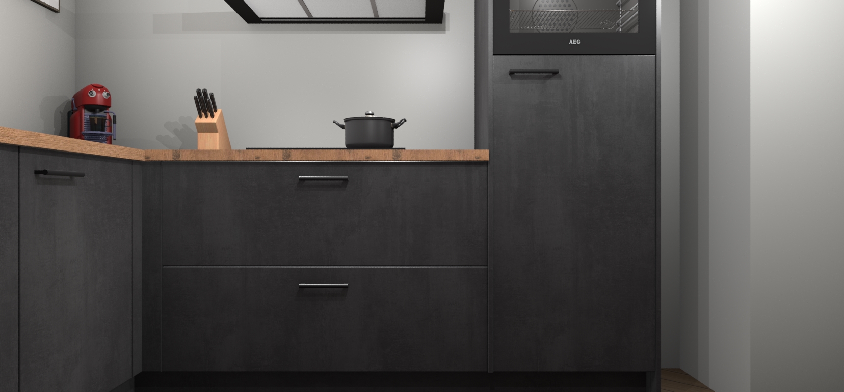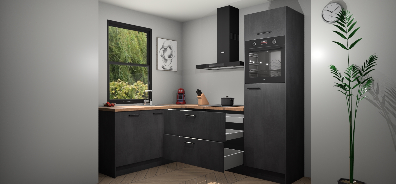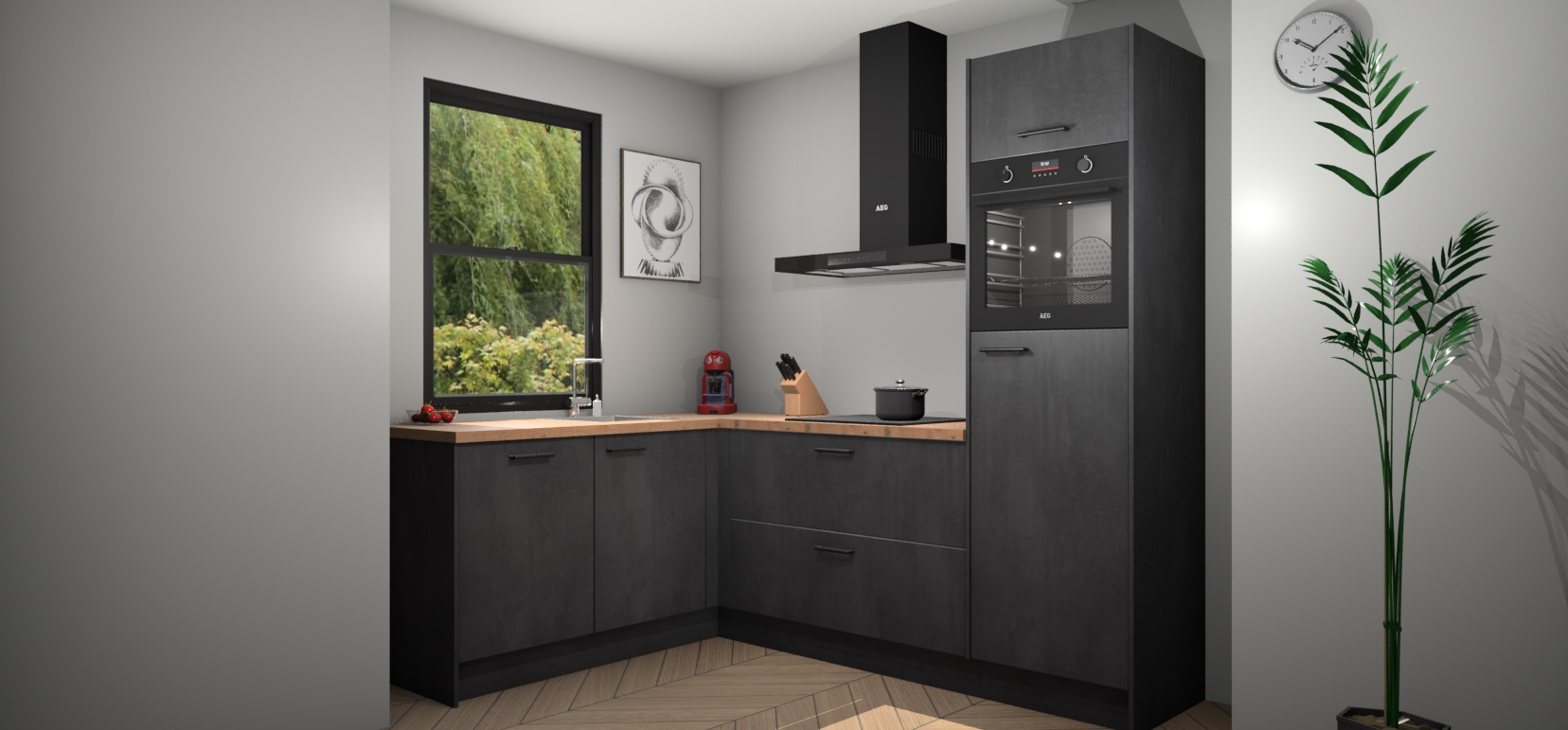 Deze prachtige hoekkeuken heeft alle benodigdheden om uw droomkook- en eetruimte compleet te maken. De Beton Zwarte kasten bieden een echo van raffinement, terwijl de 5 inbouwapparaten genoeg opties bieden voor het bereiden van heerlijke maaltijden. De oven, inductiekookplaat, afzuigkap, vaatwasser en koelkast zorgen ervoor dat u tijd in de keuken zo efficiënt mogelijk verloopt, terwijl ze ook dat extra vleugje luxe bieden.
