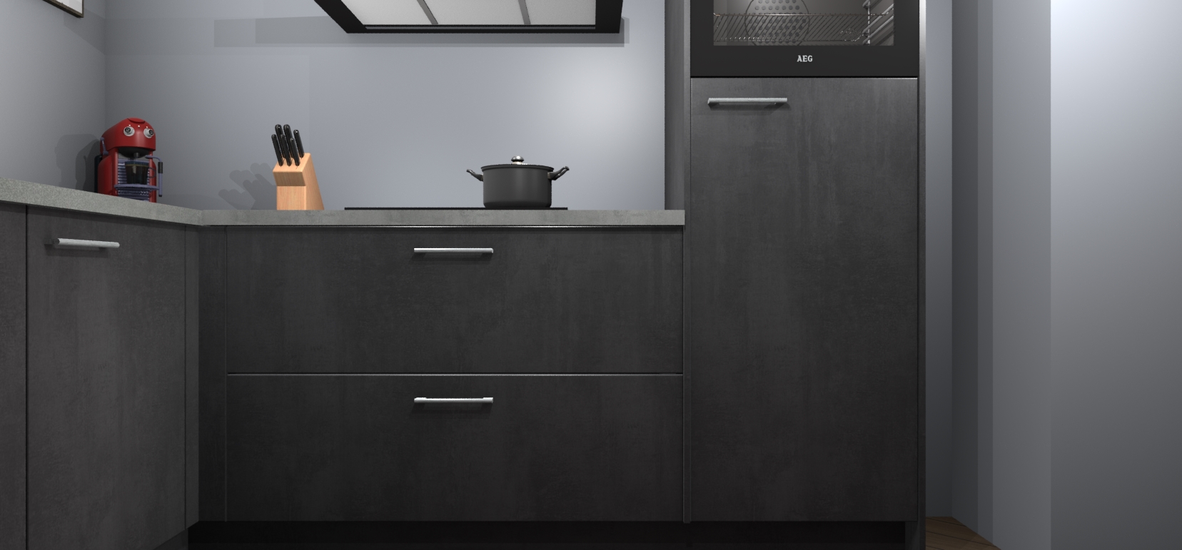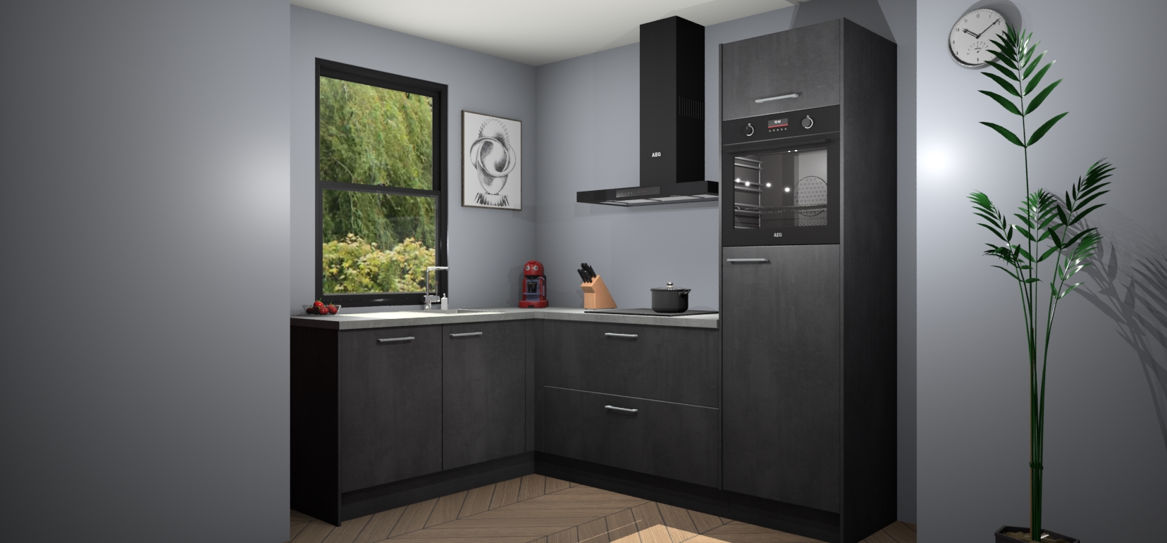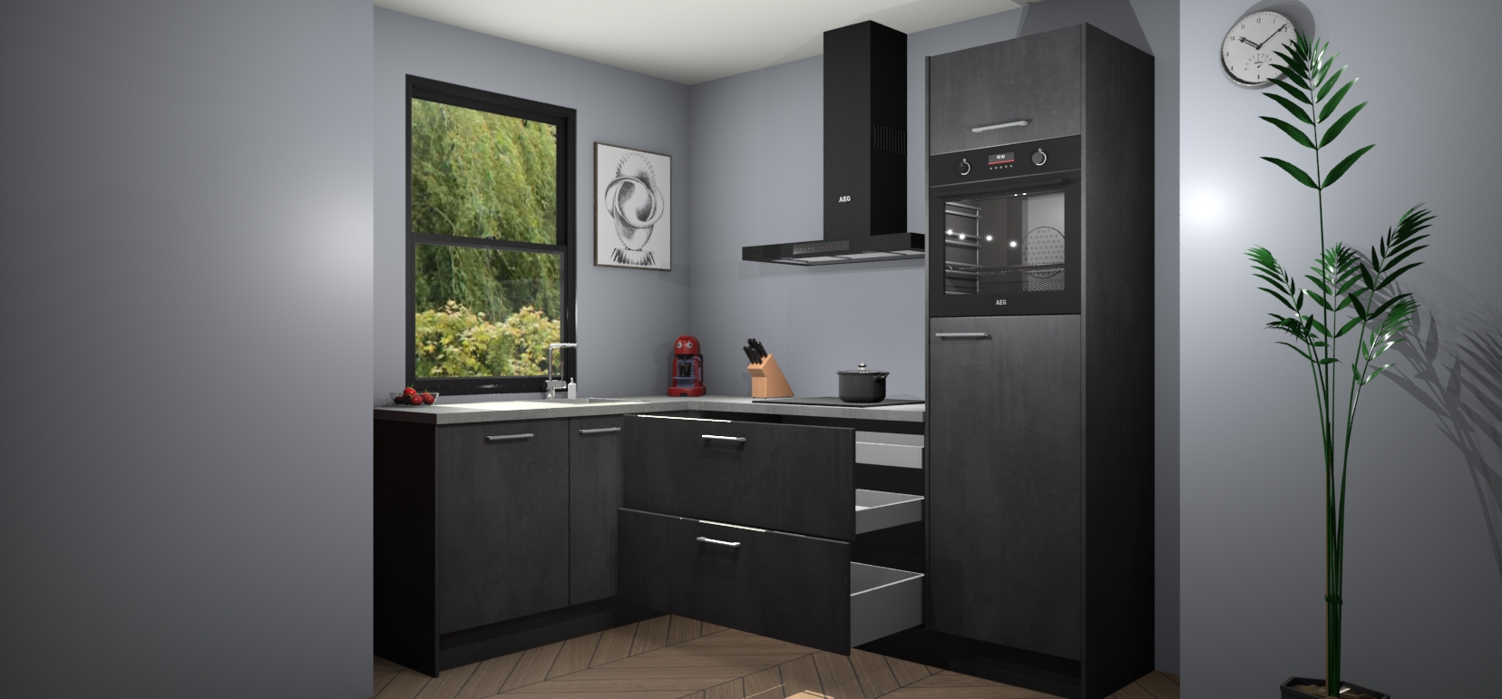 Deze prachtige hoekkeuken heeft alle benodigdheden om uw droomkook- en eetruimte compleet te maken. De Beton Zwarte kasten bieden een echo van raffinement, terwijl de 5 inbouwapparaten genoeg opties bieden voor het bereiden van heerlijke maaltijden. De oven, inductiekookplaat, afzuigkap, vaatwasser en koelkast zorgen ervoor dat u tijd in de keuken zo efficiënt mogelijk verloopt, terwijl ze ook dat extra vleugje luxe bieden.