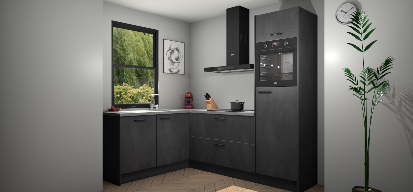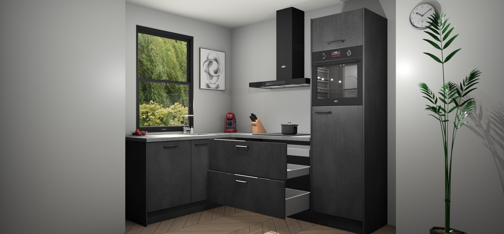 Deze prachtige hoekkeuken heeft alle benodigdheden om uw droomkook- en eetruimte compleet te maken. De Beton Zwarte kasten bieden een echo van raffinement, terwijl de 5 inbouwapparaten genoeg opties bieden voor het bereiden van heerlijke maaltijden. De oven, inductiekookplaat, afzuigkap, vaatwasser en koelkast zorgen ervoor dat u tijd in de keuken zo efficiënt mogelijk verloopt, terwijl ze ook dat extra vleugje luxe bieden.