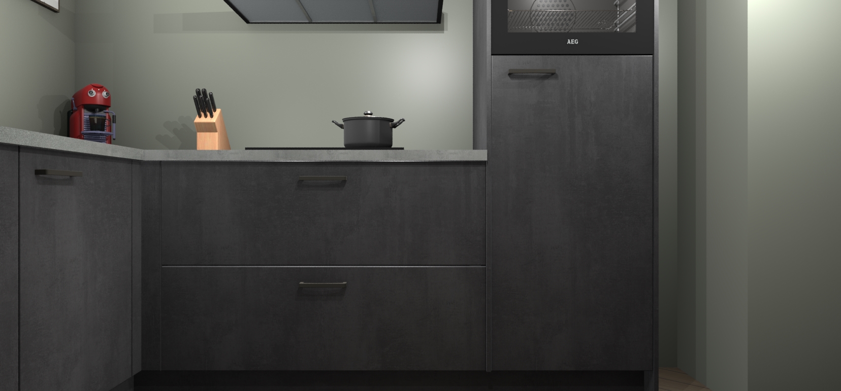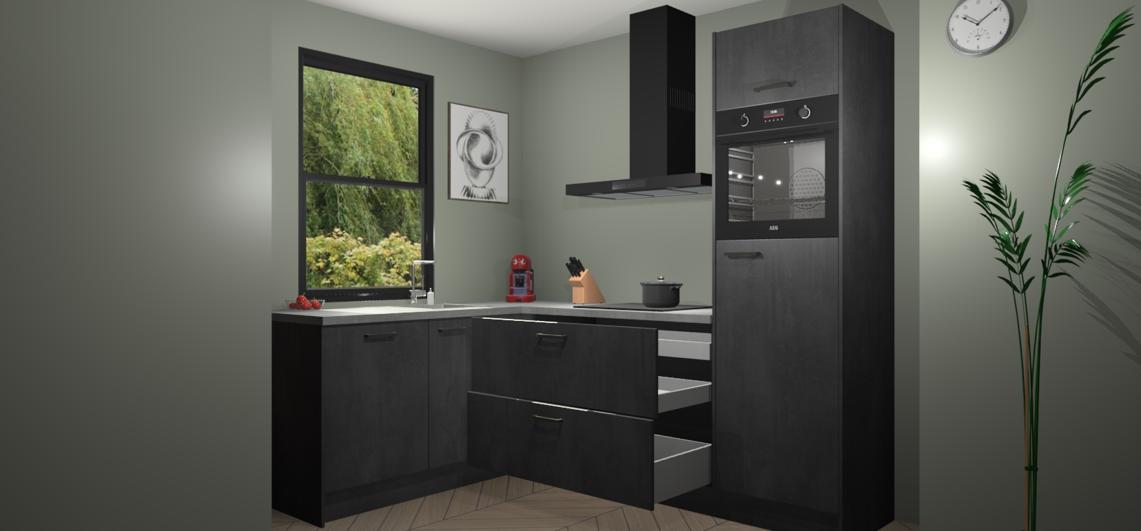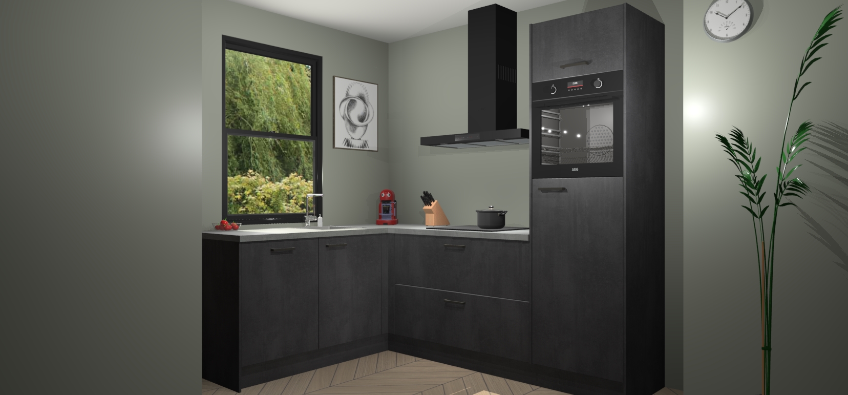 Deze prachtige hoekkeuken heeft alle benodigdheden om uw droomkook- en eetruimte compleet te maken. De Beton Zwarte kasten bieden een echo van raffinement, terwijl de 5 inbouwapparaten genoeg opties bieden voor het bereiden van heerlijke maaltijden. De oven, inductiekookplaat, afzuigkap, vaatwasser en koelkast zorgen ervoor dat u tijd in de keuken zo efficiënt mogelijk verloopt, terwijl ze ook dat extra vleugje luxe bieden.