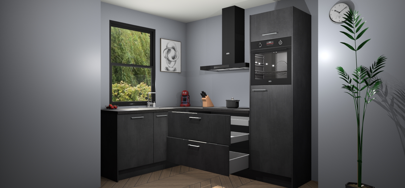 Deze prachtige hoekkeuken heeft alle benodigdheden om uw droomkook- en eetruimte compleet te maken. De Beton Zwarte kasten bieden een echo van raffinement, terwijl de 5 inbouwapparaten genoeg opties bieden voor het bereiden van heerlijke maaltijden. De oven, inductiekookplaat, afzuigkap, vaatwasser en koelkast zorgen ervoor dat u tijd in de keuken zo efficiënt mogelijk verloopt, terwijl ze ook dat extra vleugje luxe bieden.