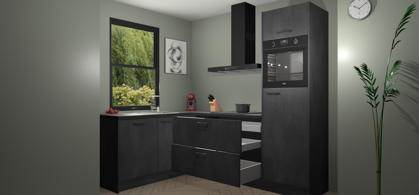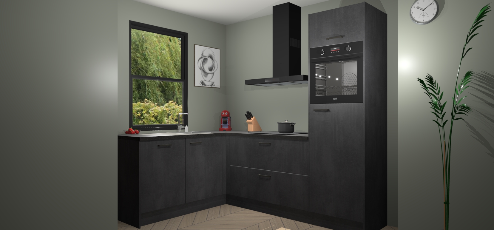 Deze prachtige hoekkeuken heeft alle benodigdheden om uw droomkook- en eetruimte compleet te maken. De Beton Zwarte kasten bieden een echo van raffinement, terwijl de 5 inbouwapparaten genoeg opties bieden voor het bereiden van heerlijke maaltijden. De oven, inductiekookplaat, afzuigkap, vaatwasser en koelkast zorgen ervoor dat u tijd in de keuken zo efficiënt mogelijk verloopt, terwijl ze ook dat extra vleugje luxe bieden.