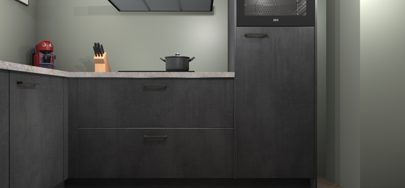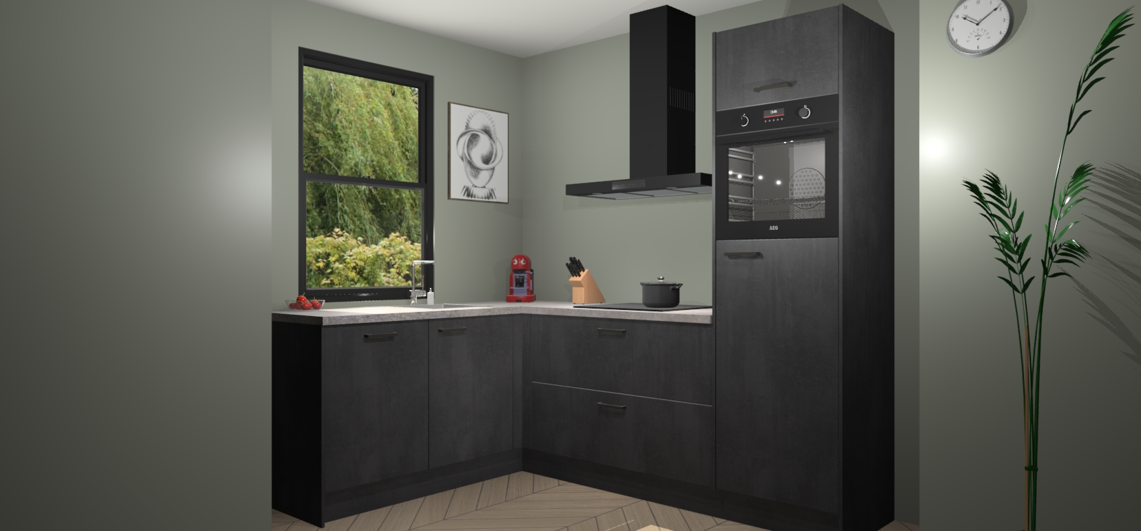 Deze prachtige hoekkeuken heeft alle benodigdheden om uw droomkook- en eetruimte compleet te maken. De Beton Zwarte kasten bieden een echo van raffinement, terwijl de 5 inbouwapparaten genoeg opties bieden voor het bereiden van heerlijke maaltijden. De oven, inductiekookplaat, afzuigkap, vaatwasser en koelkast zorgen ervoor dat u tijd in de keuken zo efficiënt mogelijk verloopt, terwijl ze ook dat extra vleugje luxe bieden.