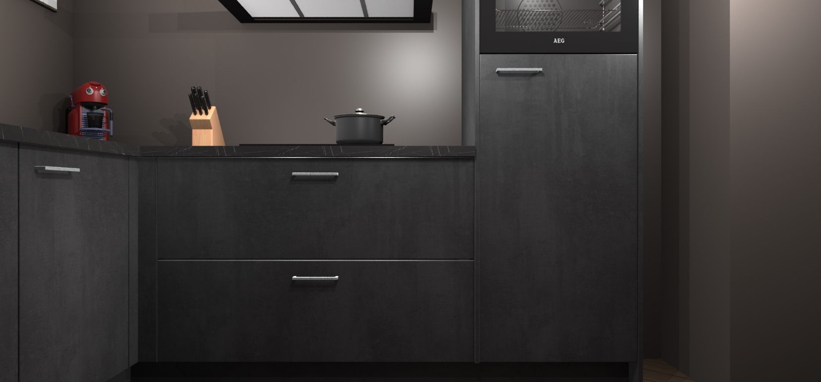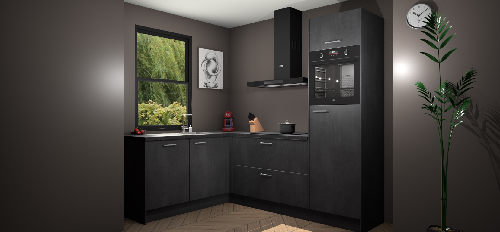 Deze prachtige hoekkeuken heeft alle benodigdheden om uw droomkook- en eetruimte compleet te maken. De Beton Zwarte kasten bieden een echo van raffinement, terwijl de 5 inbouwapparaten genoeg opties bieden voor het bereiden van heerlijke maaltijden. De oven, inductiekookplaat, afzuigkap, vaatwasser en koelkast zorgen ervoor dat u tijd in de keuken zo efficiënt mogelijk verloopt, terwijl ze ook dat extra vleugje luxe bieden.