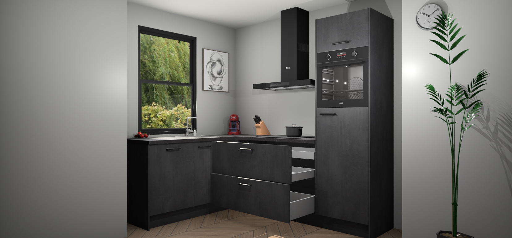 Deze prachtige hoekkeuken heeft alle benodigdheden om uw droomkook- en eetruimte compleet te maken. De Beton Zwarte kasten bieden een echo van raffinement, terwijl de 5 inbouwapparaten genoeg opties bieden voor het bereiden van heerlijke maaltijden. De oven, inductiekookplaat, afzuigkap, vaatwasser en koelkast zorgen ervoor dat u tijd in de keuken zo efficiënt mogelijk verloopt, terwijl ze ook dat extra vleugje luxe bieden.