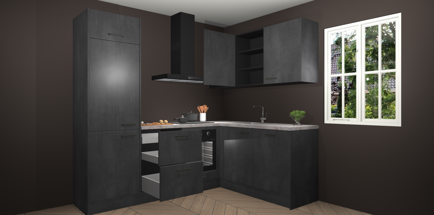 Bestellen was nog nooit zo makkelijk en we leveren met slechts 7 weken; zodra de keuken arriveert staan de kasten voor gemonteerd klaar om er alles aan te doen dat u hem gemakkelijk zelf kunt installeren! Eén ding is zeker: met de Beton Zwarte keuken Krakau slaagt u erin modischer, modernere keukens uit te rusten die tientallen jaren meegaan! Haal snel uw Beton Zwarte keuken Krakau - of u nu net begint of al 'levenservaring' hebt in de keukendroomloopbaan - want dit topmodel van onze collectie wilt u absoluut niet missen.