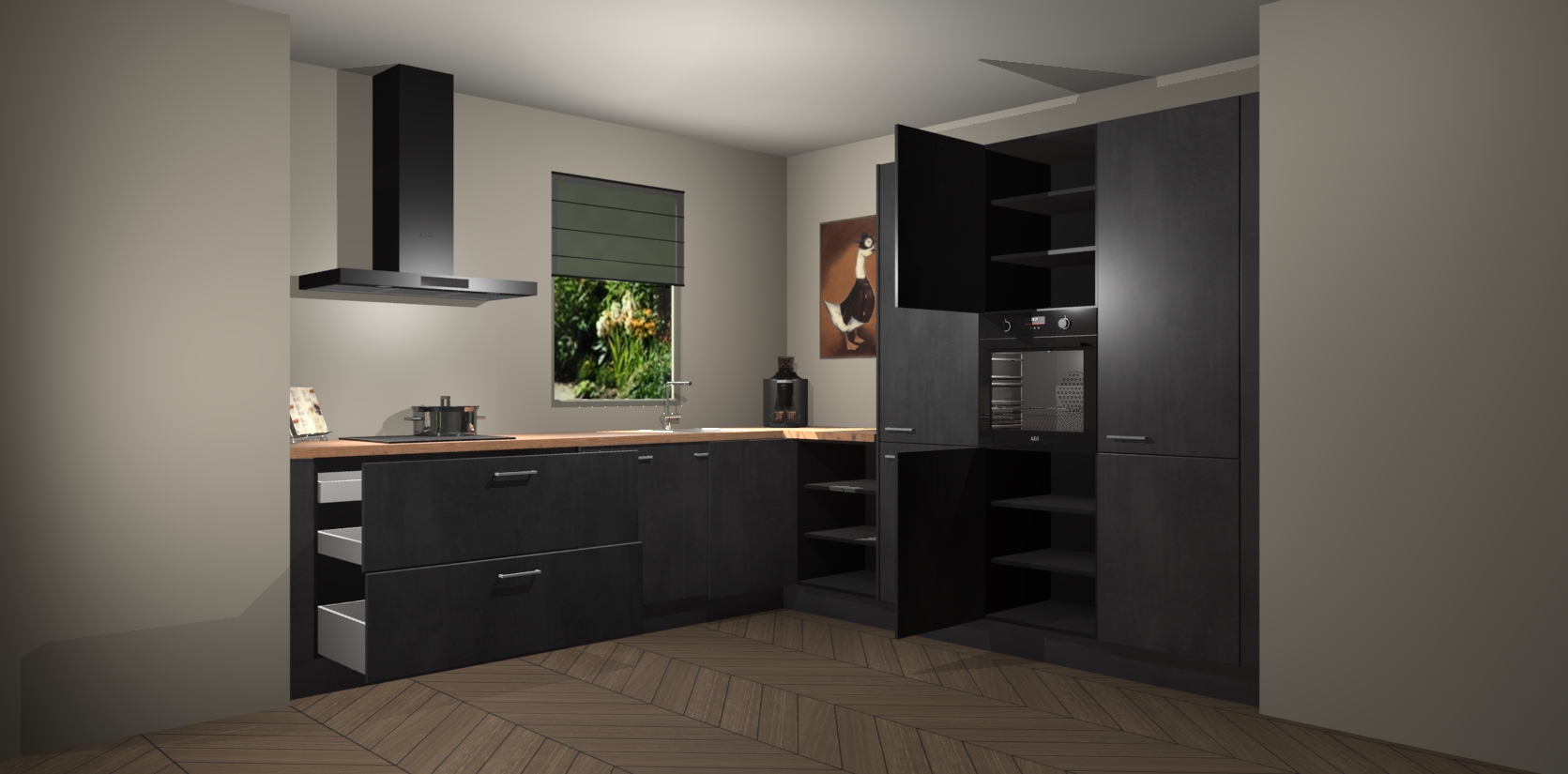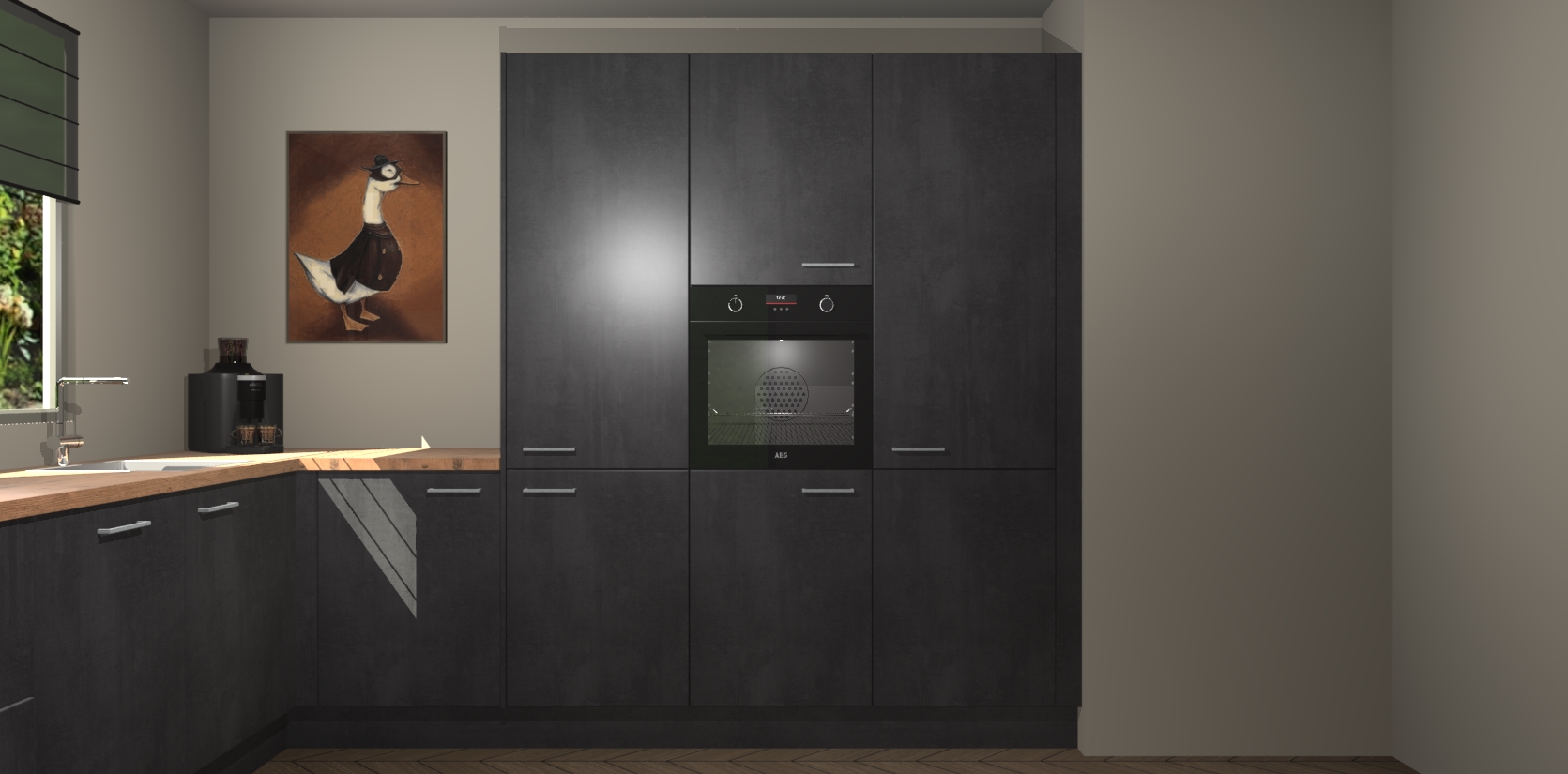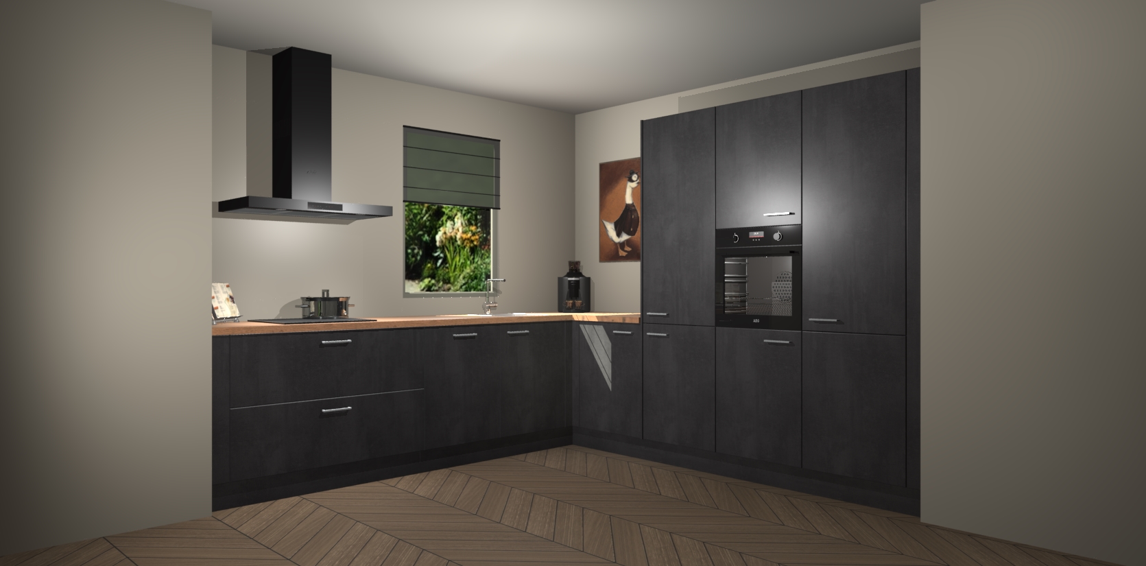 Welkom bij de Beton Zwarte keuken Laos. Deze prachtige keuken zal de komende jaren het middelpunt van de belangstelling in uw huis zijn. Uitgerust met vijf inbouwapparaten komt u nooit kookgereedschap tekort. Bovendien geeft de warme houtlook elke ruimte een uitnodigende en tijdloze uitstraling.