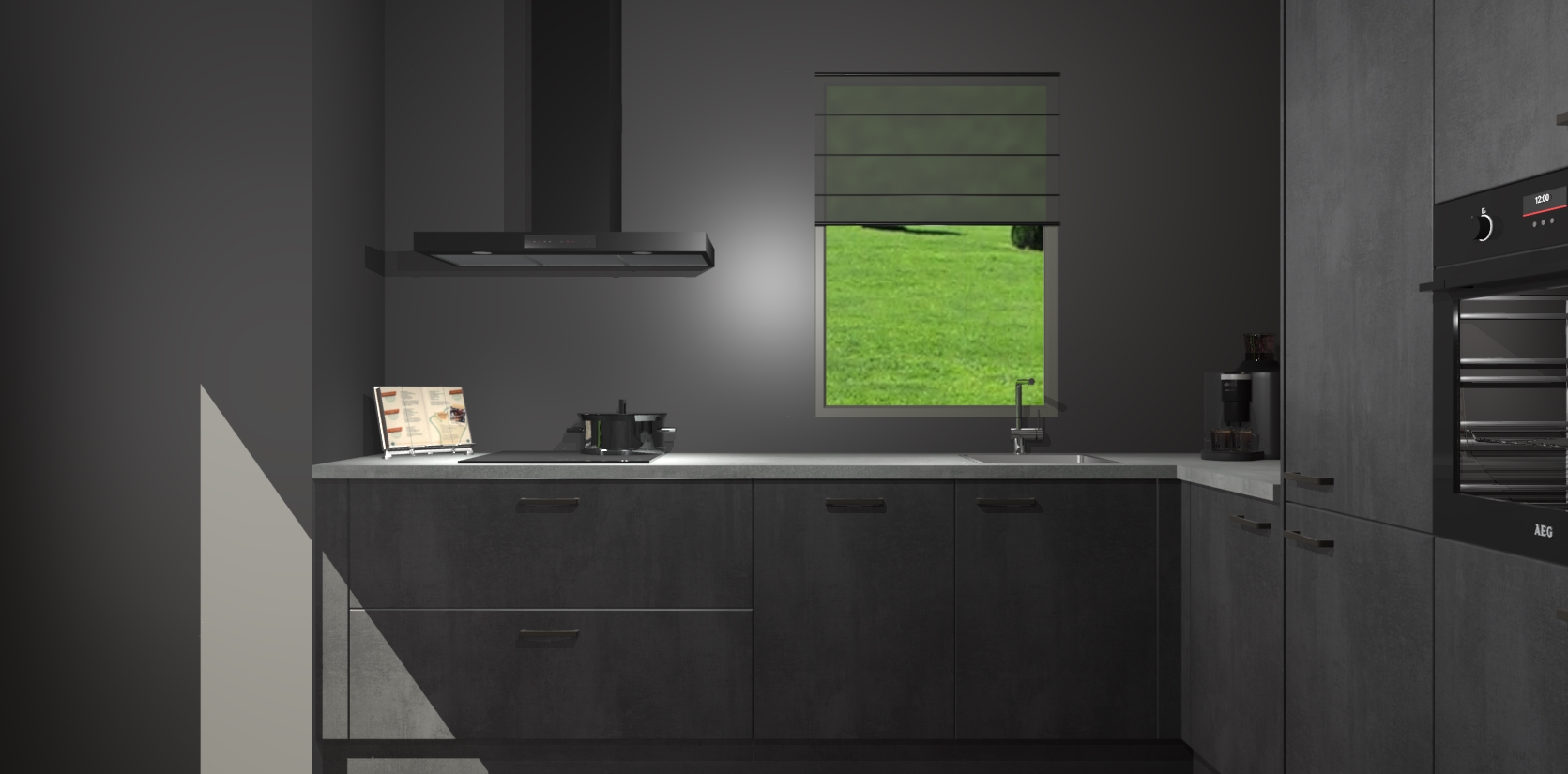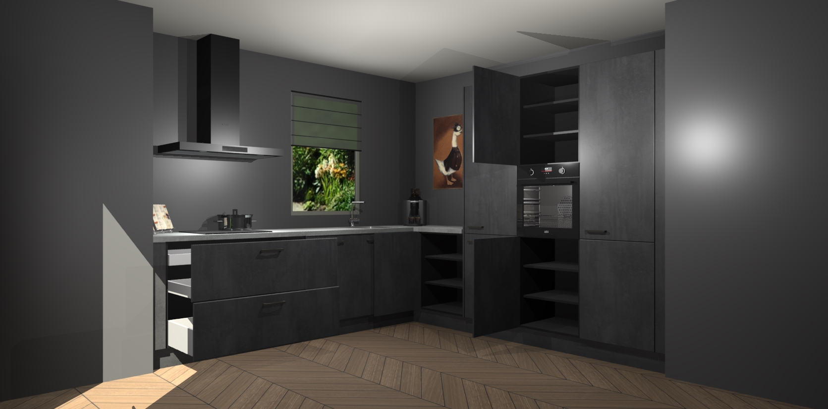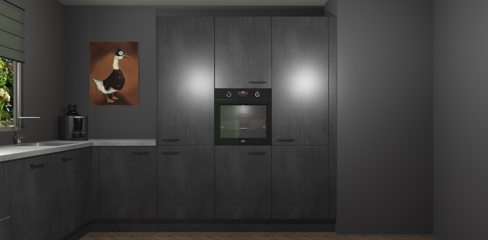 Welkom bij de Beton Zwarte keuken Laos. Deze prachtige keuken zal de komende jaren het middelpunt van de belangstelling in uw huis zijn. Uitgerust met vijf inbouwapparaten komt u nooit kookgereedschap tekort. Bovendien geeft de warme houtlook elke ruimte een uitnodigende en tijdloze uitstraling.