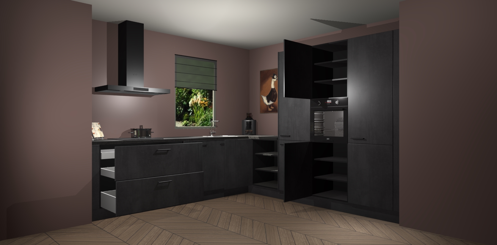 Welkom bij de Beton Zwarte keuken Laos. Deze prachtige keuken zal de komende jaren het middelpunt van de belangstelling in uw huis zijn. Uitgerust met vijf inbouwapparaten komt u nooit kookgereedschap tekort. Bovendien geeft de warme houtlook elke ruimte een uitnodigende en tijdloze uitstraling.