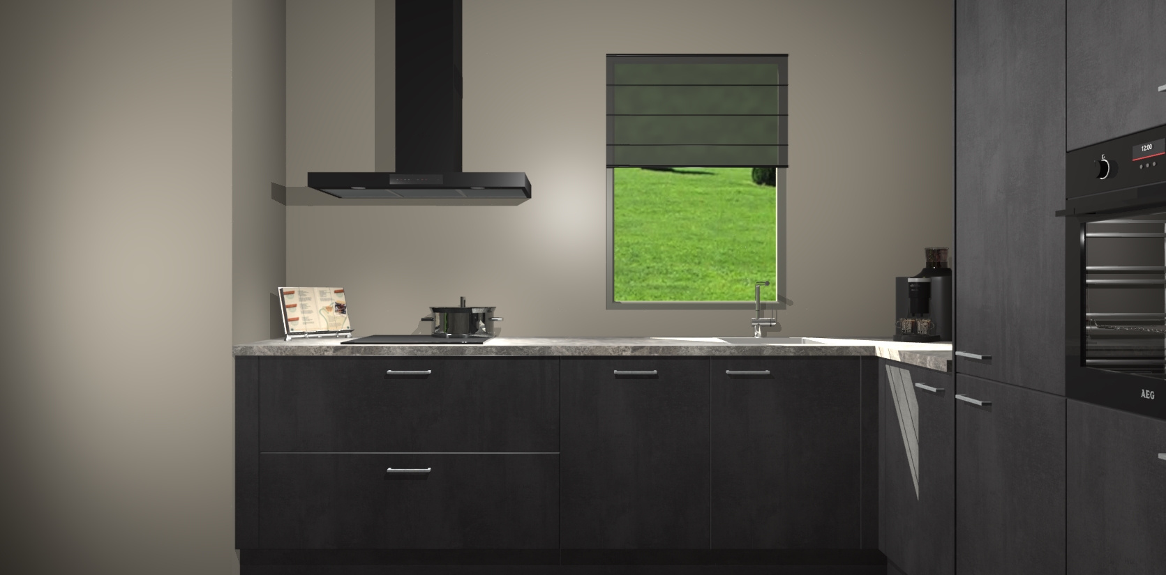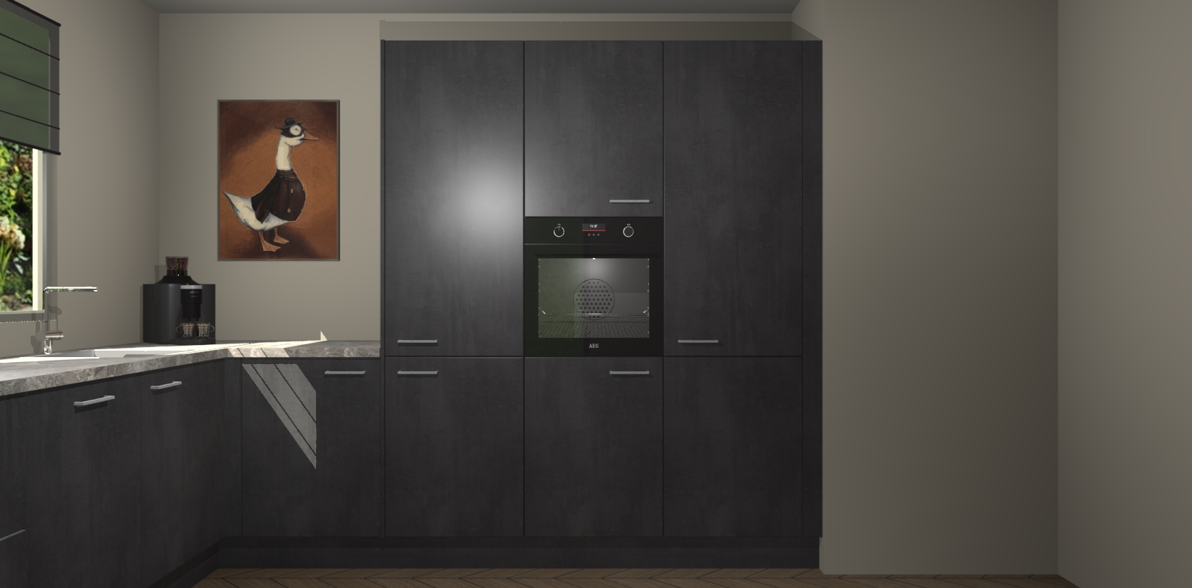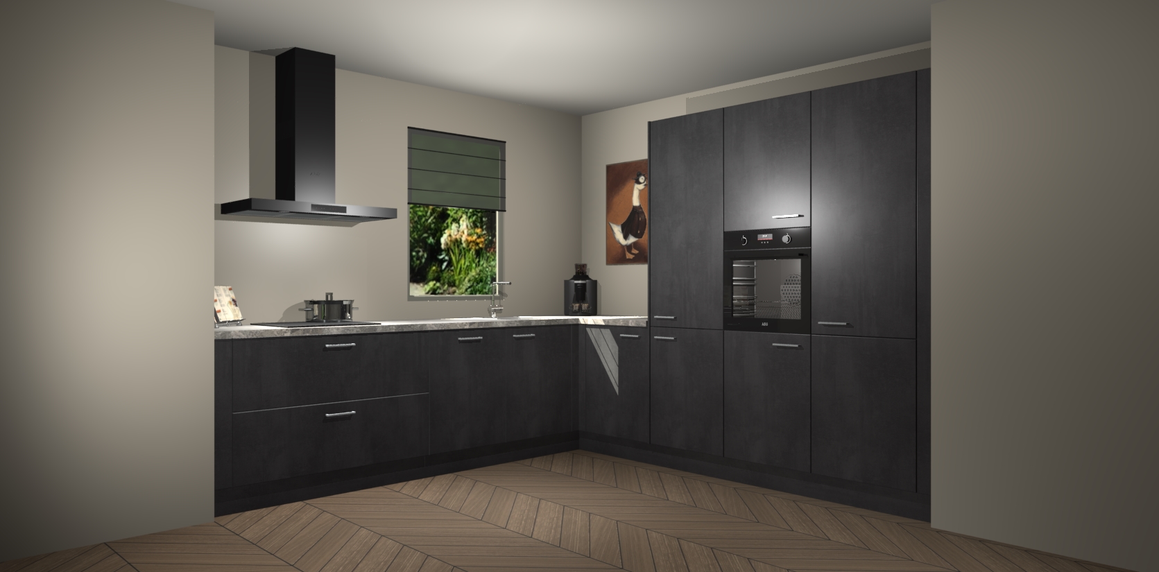 Welkom bij de Beton Zwarte keuken Laos. Deze prachtige keuken zal de komende jaren het middelpunt van de belangstelling in uw huis zijn. Uitgerust met vijf inbouwapparaten komt u nooit kookgereedschap tekort. Bovendien geeft de warme houtlook elke ruimte een uitnodigende en tijdloze uitstraling.