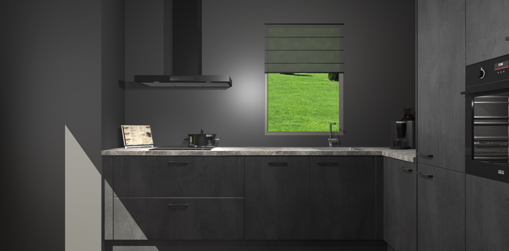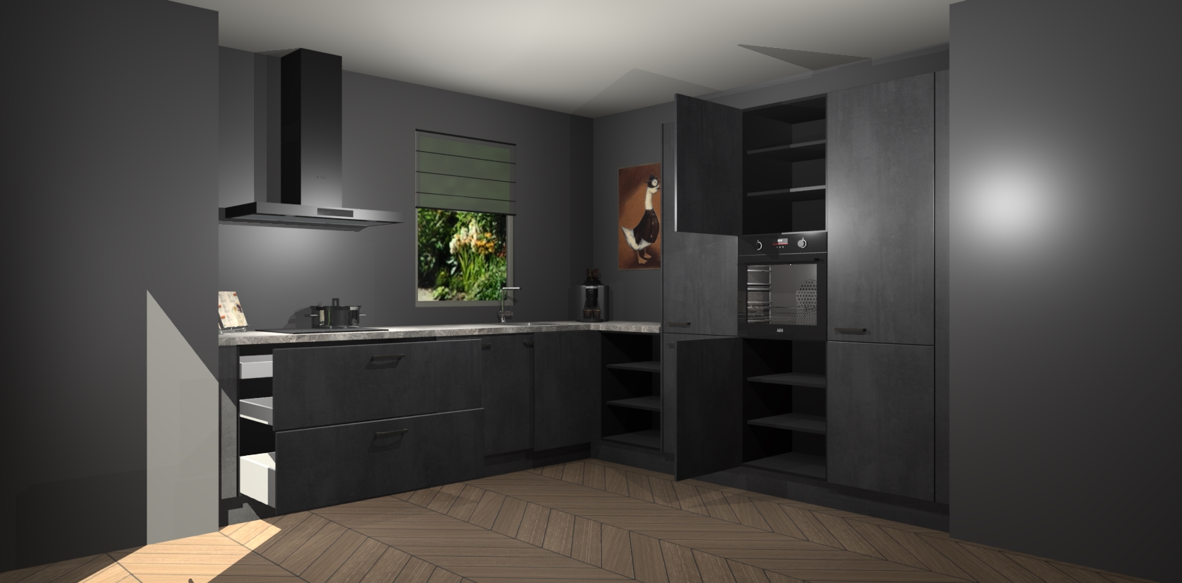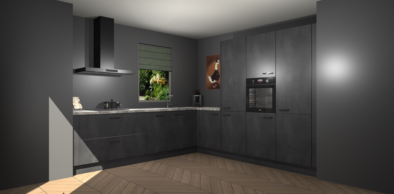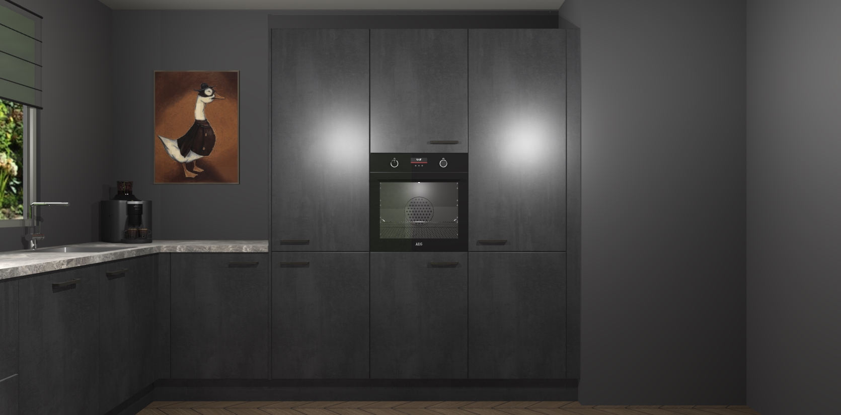 Welkom bij de Beton Zwarte keuken Laos. Deze prachtige keuken zal de komende jaren het middelpunt van de belangstelling in uw huis zijn. Uitgerust met vijf inbouwapparaten komt u nooit kookgereedschap tekort. Bovendien geeft de warme houtlook elke ruimte een uitnodigende en tijdloze uitstraling.